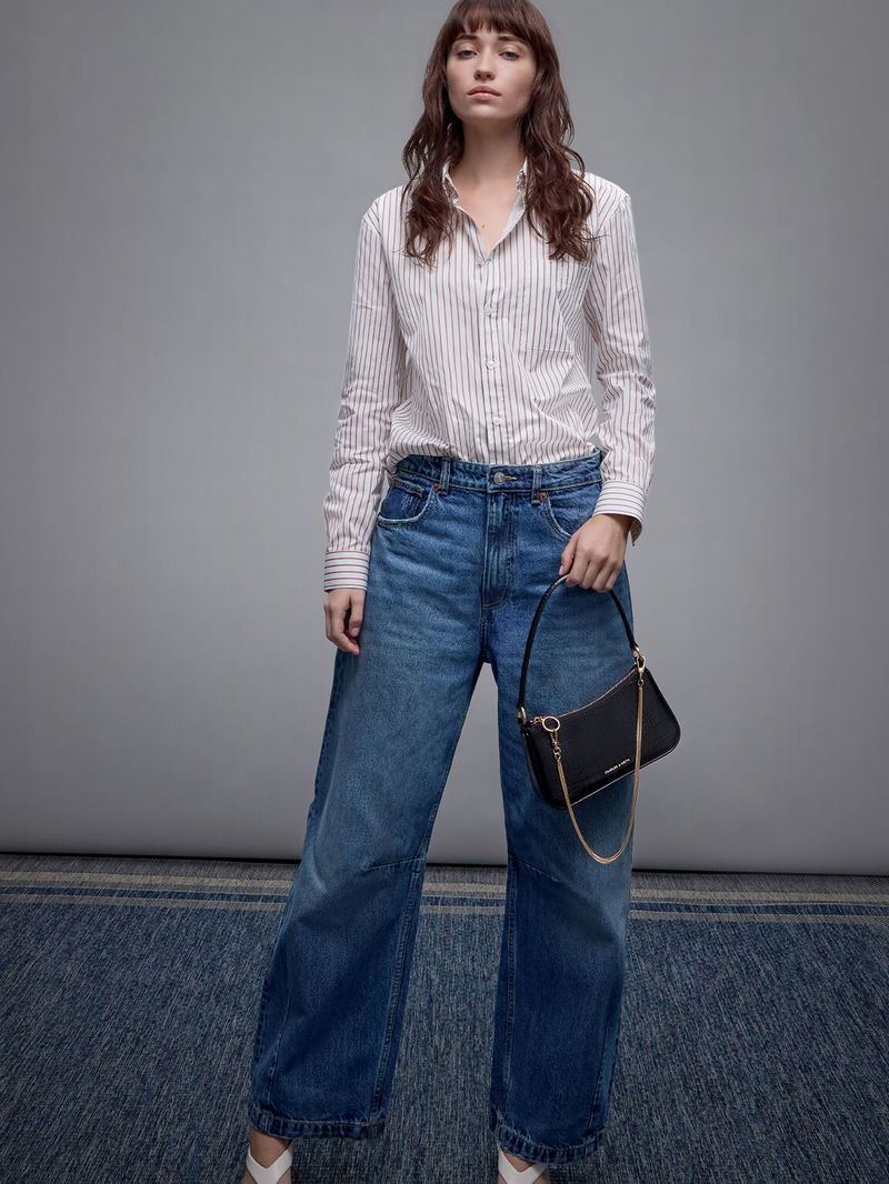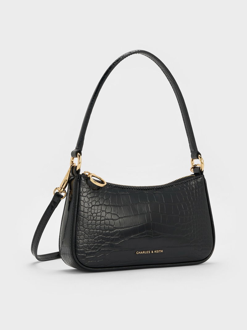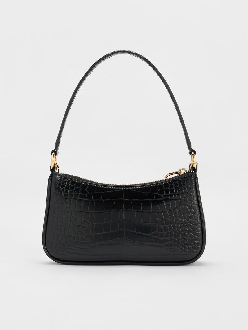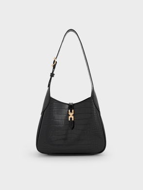 The Elspeth shoulder bag returns this season with a fresh update: an elegant crocodile effect enhances its sleek black finish, adding rich texture to the otherwise minimalist design. Accented with a gold-toned hanging chain, it strikes the perfect balance between glamour and cool. Let the Elspeth be your go-to companion on days when you are travelling light.