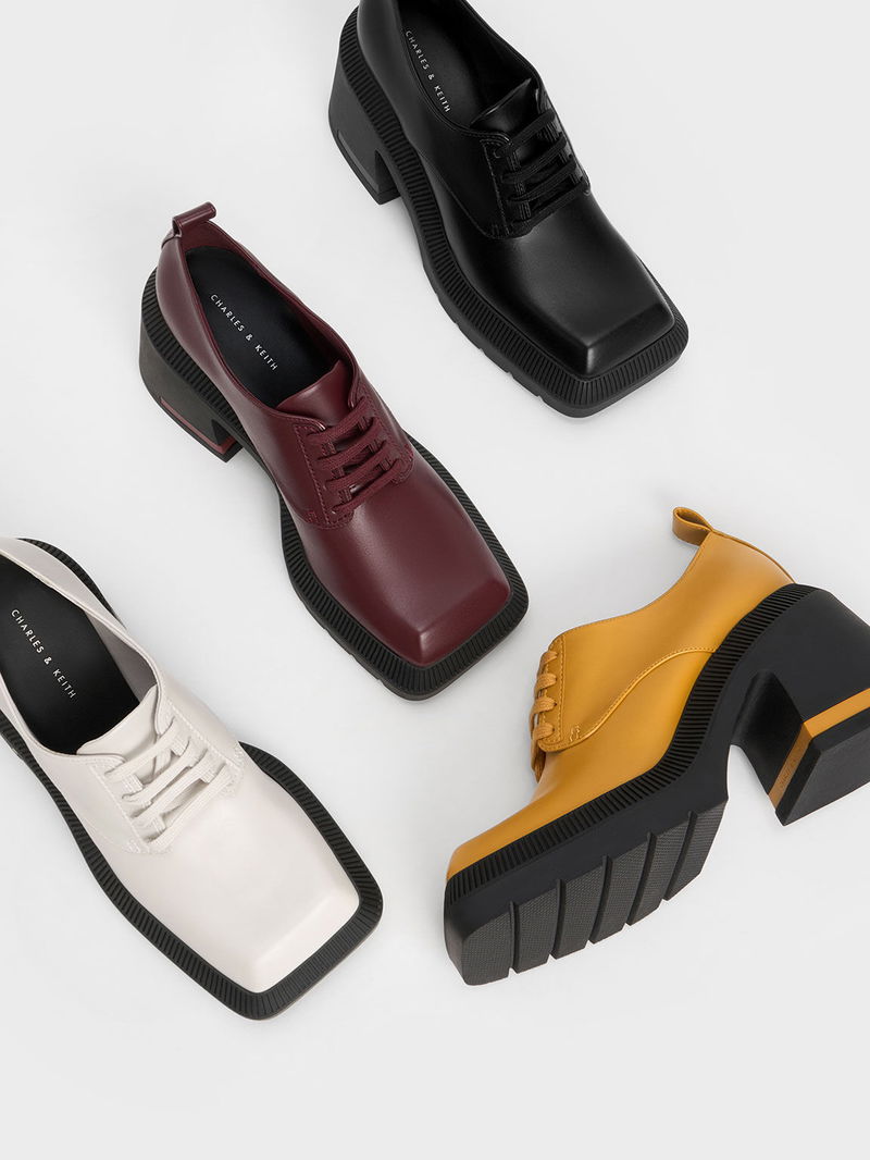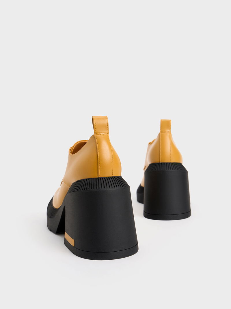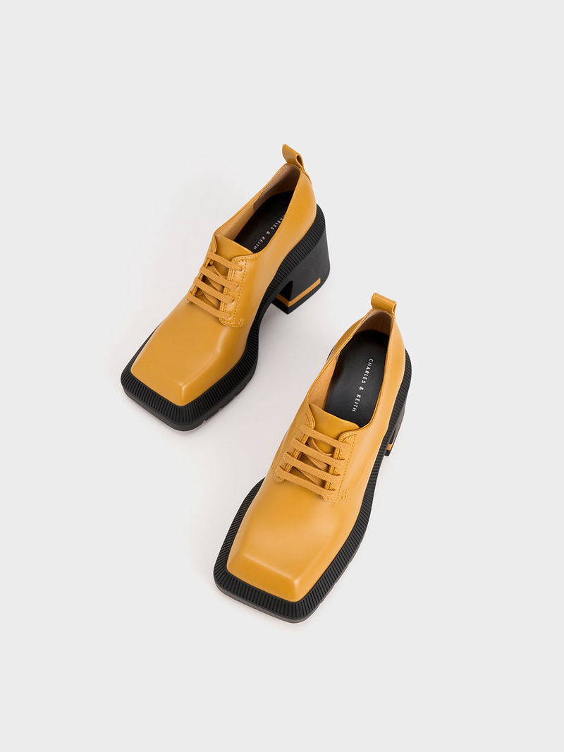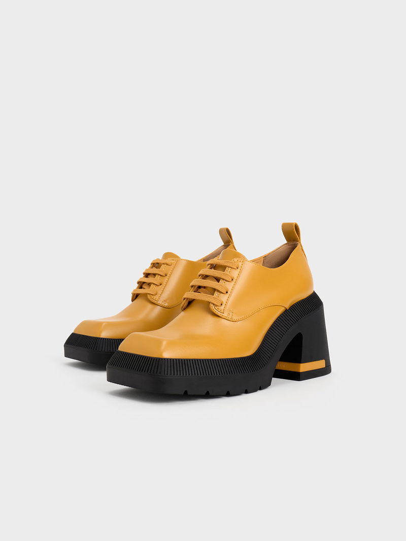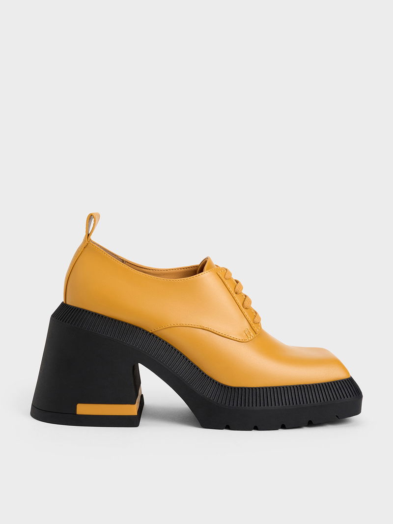 Elevate your style and stature with our Emery chunky Oxford shoes. Set on impressive 9cm high block heels, they are as stature-boosting as any heeled shoes — except that they also offer all-day comfort. The striking mustard-yellow finish will certainly turn heads wherever you go and will liven up your look. Plus points for the distinctive geometric toe caps that add visual interest.