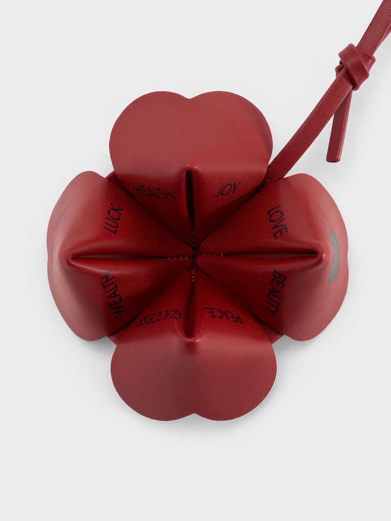 This charm keychain features a four-leaf clover motif that is formed by four pink heart-shaped petals. With a spring-ring closure, you can easily hook it onto your favourite bag to give it a distinctive touch. This can also be used as a keychain.