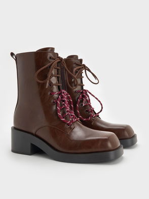 Dark green combat boots featuring furry cuff details and lace up fastening.