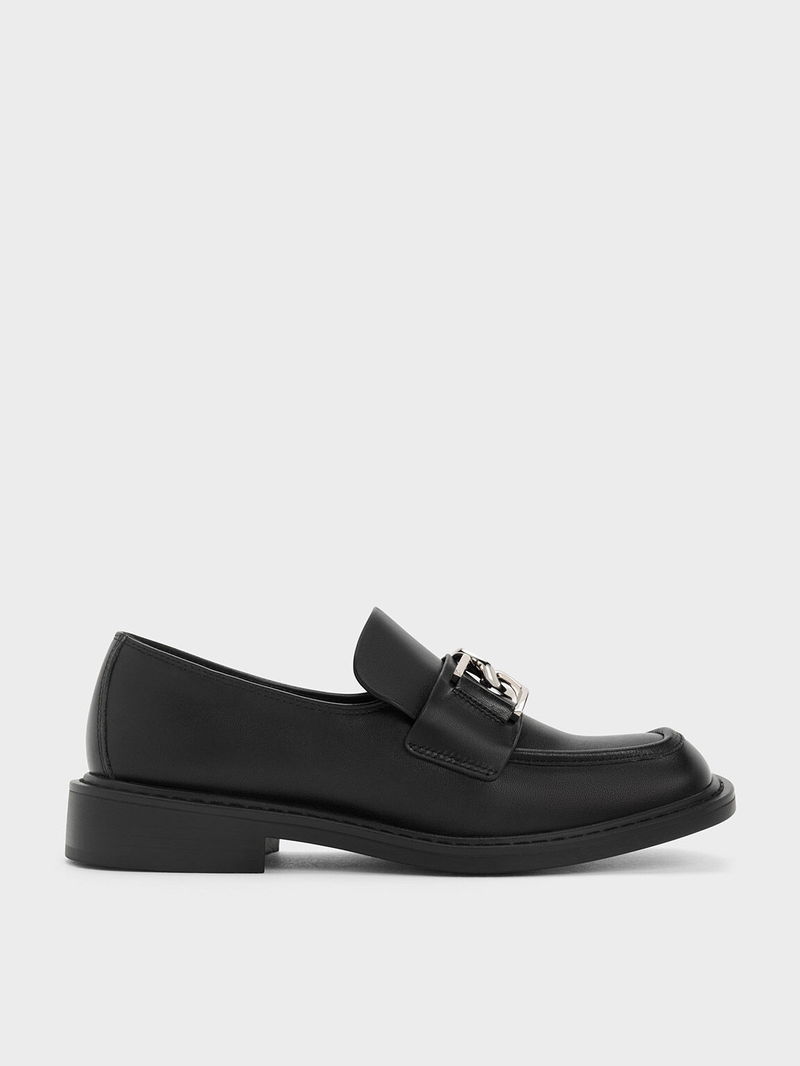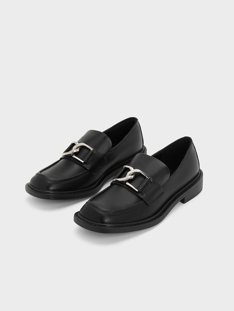 Introducing the newest member of the Gabine family: a pair of elegant leather loafers. These loafers showcase the iconic U-shaped buckles interlocked across the front in a sleek silver tone, adding a touch of understated glamour to the classic design.