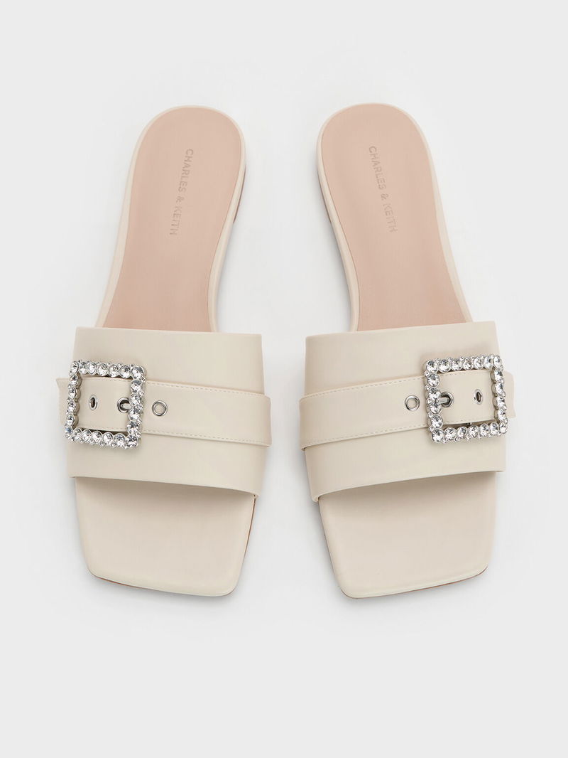 Gem-Buckle Square-Toe Slide Sandals