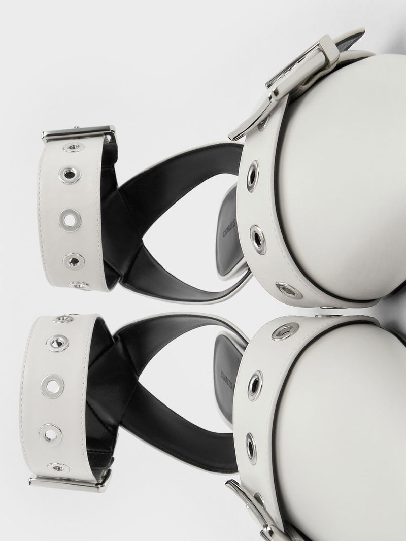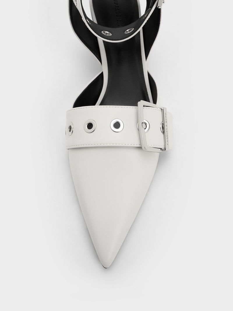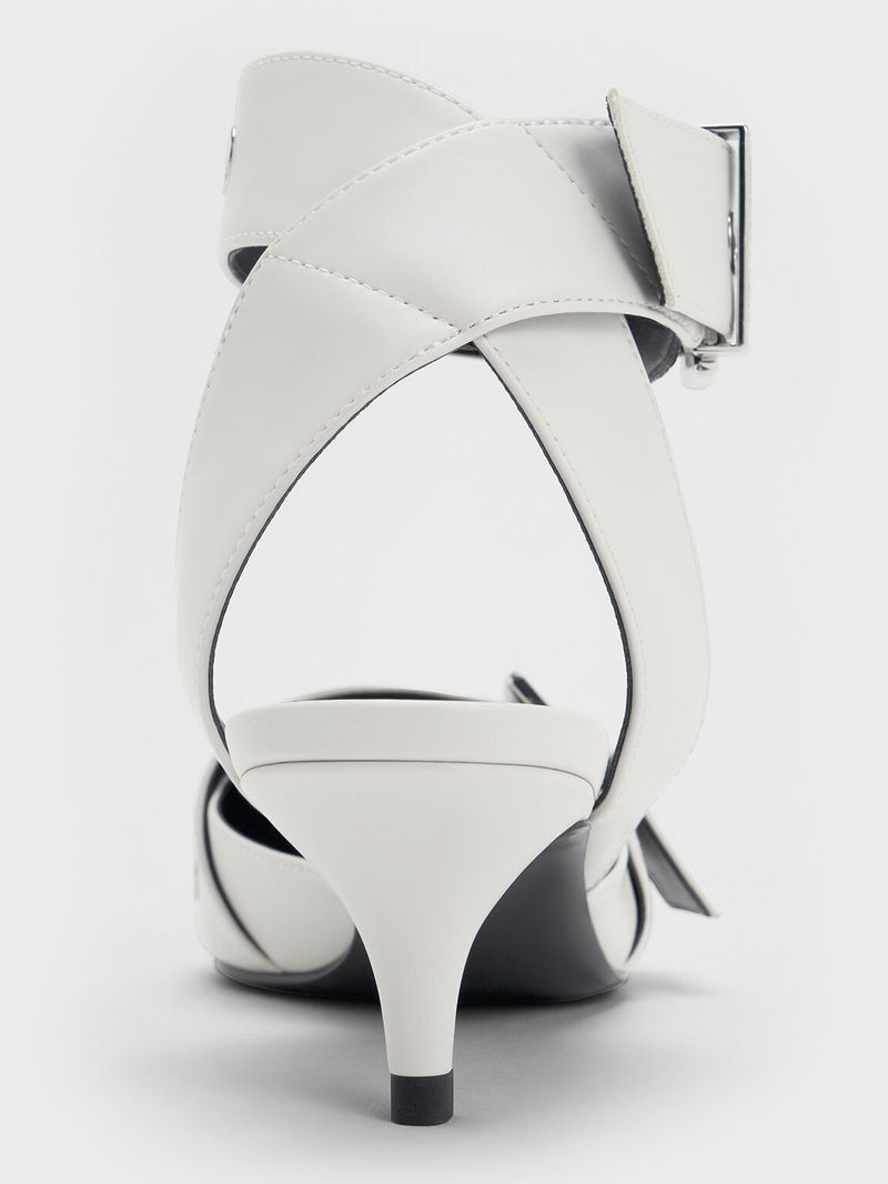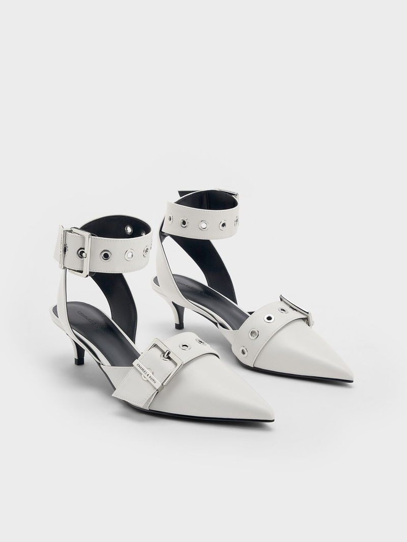 For shoes that have an understated wow factor, look no further than these kitten-heeled pumps. Featuring a sharp pointed-toed silhouette, these shoes are taken to new style heights with the addition of thick, buckled grommet straps that make them stand out and make an impression. The soft white finish softens the bold design while still making it a versatile choice that is great for both work and play.