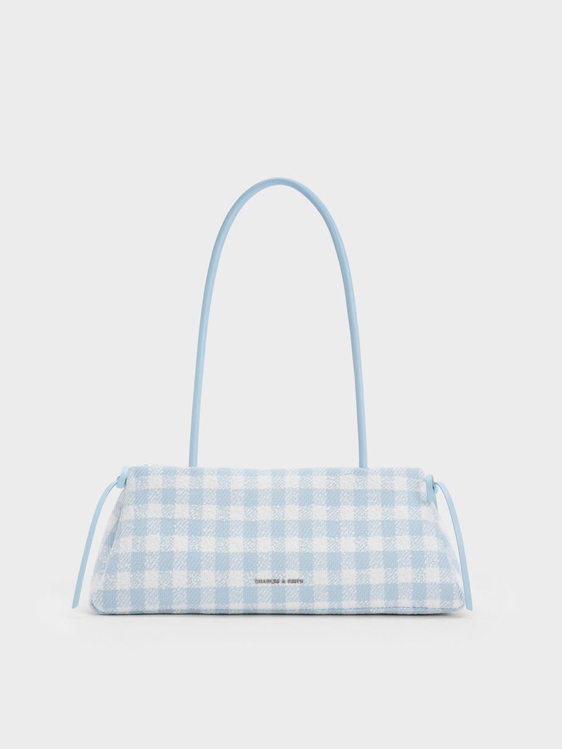 This Hazel shoulder bag features a light-blue gingham print with matching bow details on either side. Designed with a chic trapeze shape, elongated handles and a secure zip closure, it makes the perfect statement bag to complete your going-out ensembles.