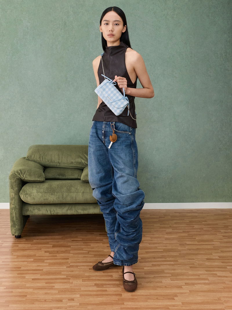 This Hazel wallet on chain in blue features a playful gingham pattern, a classic rectangular silhouette, a top handle adorned with side-bow details and a push-lock closure that opens up to multiple inner compartments. Carry it with casual dresses or denim looks for a charming accent that feels lighthearted yet polished.