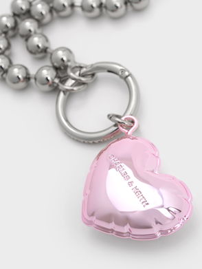 Gold keychain featuring a key and red heart charm. Fastens with a heart shaped push-clasp closure.