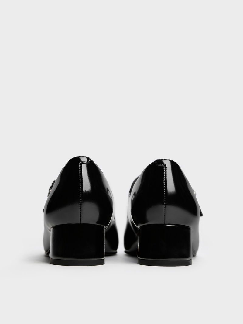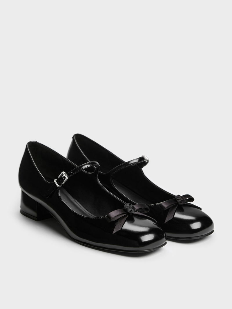 These Kelis Mary Jane pumps in black feature charming rose-bow details, low block heels, covered round toes and slim adjustable straps. Wear them with trousers or skirts for a classic look that balances timeless elegance with everyday practicality.