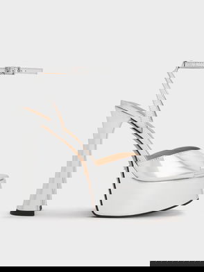 Nothing says "let's get this party started" like sculptural chrome heels. Finished in smooth kid suede, this strappy number will turn heads the minute you step out. Try them with muted separates.