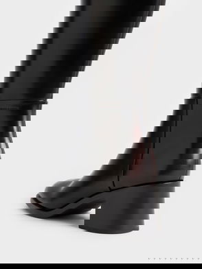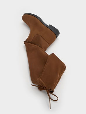 The higher the boots, the more alluring the outfit. Slip into these kid suede over-the-knee cone heel boots with a trench coat dress and a half moon shoulder bag for a chic all-day look.