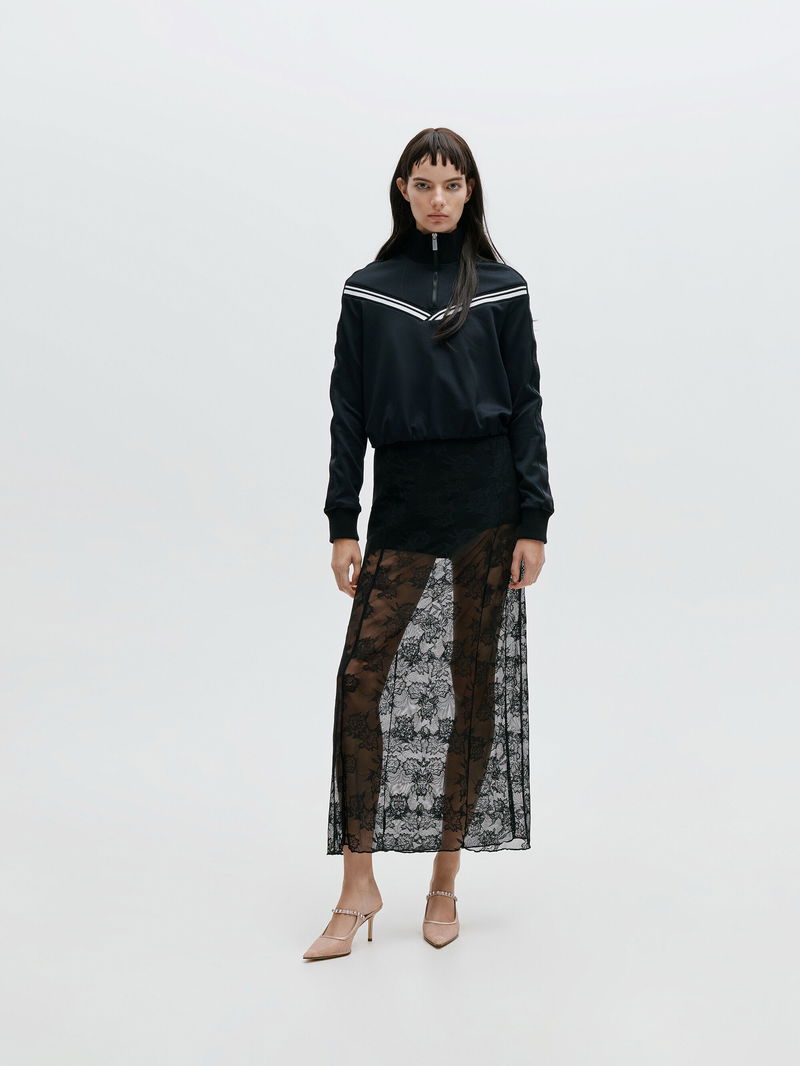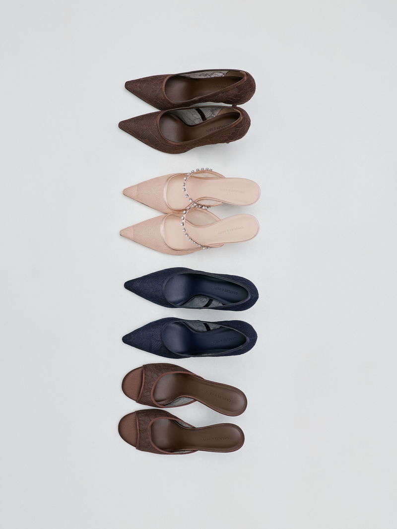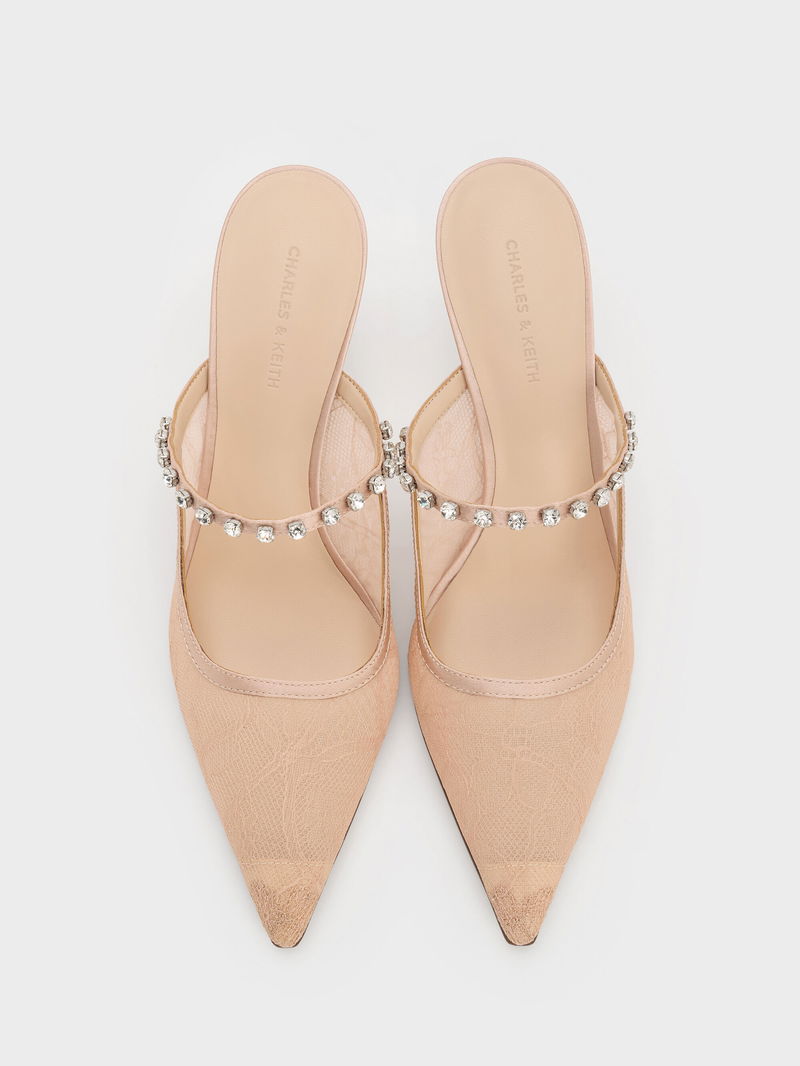 These mules in nude are made with lace and satin. They feature sparkling crystal embellishments, stiletto heels, and sleek pointed toes. Wear them with long fluid dresses to keep your evening look effortlessly elegant.