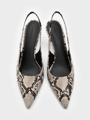For maximum style impact, look no further than these slingback pumps in an all-over snake-print design. This striking pair features a sleek and polished pointed-toed design, which is embellished with shiny metallic accents on the fronts. These pumps are made for the woman who is not afraid to stand out. Made with recycled faux leather, they will please the eco-conscious fashion-lover.