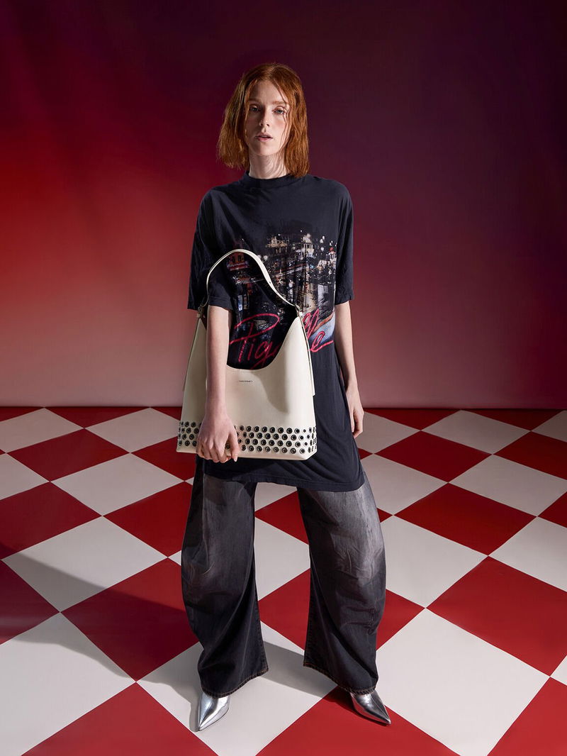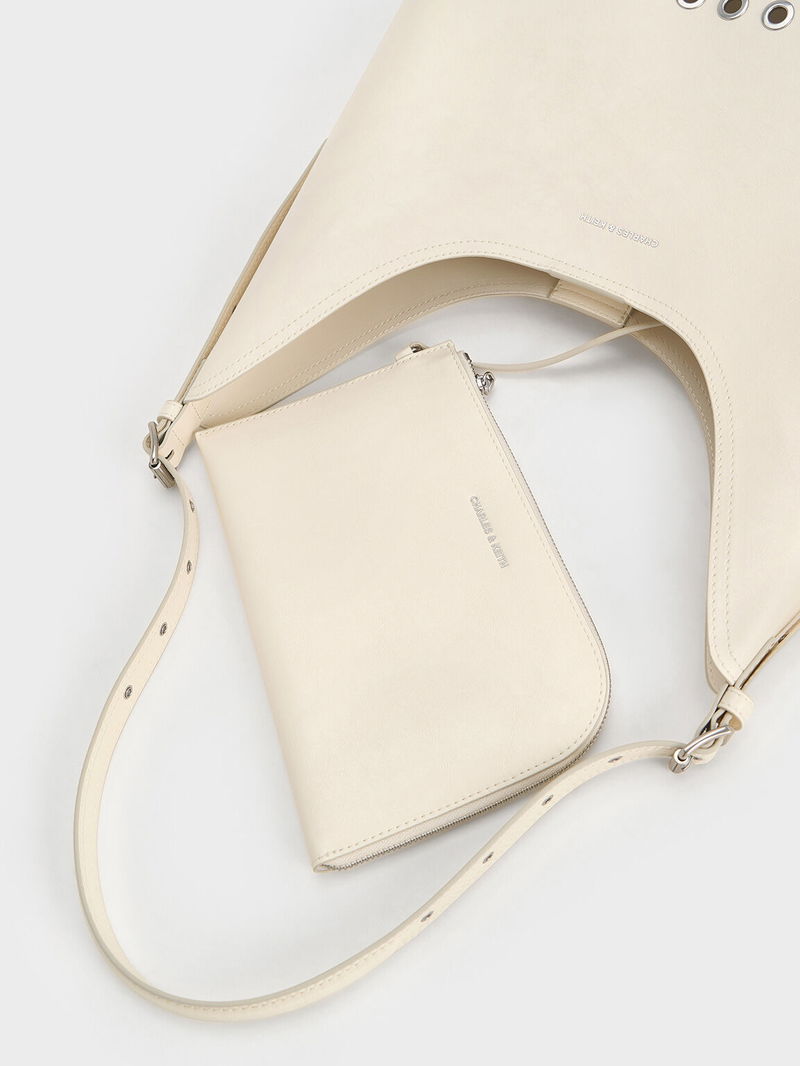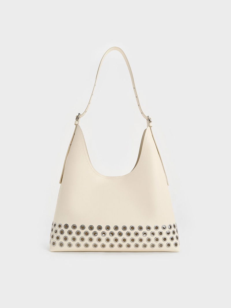 The soft cream finish contrasted by silver grommet details is perfect for elevating your casual off-duty outfits with an edgy, grunge-inspired touch.