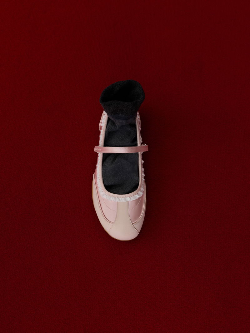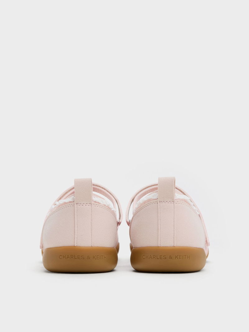 These Louise Mary Jane sneakers in light pink are made with satin and feature contrasting textured panels, pretty lace-trims, soft round toes, adjustable velcro straps and sturdy rubber soles. They will pair well with both sporty casual looks and dressy date-night outfits.