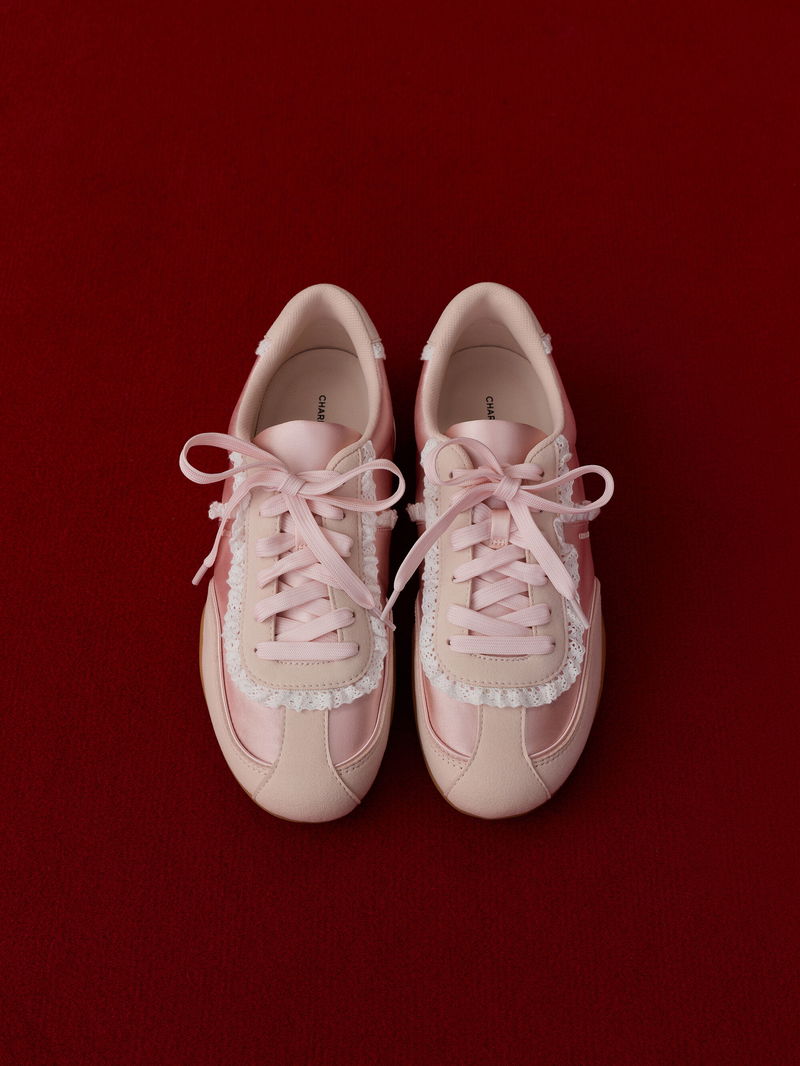 These Louise sneakers in light pink are made with satin and feature lace-trim detailing, contrast panels and detachable front flaps for versatile styling.