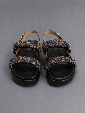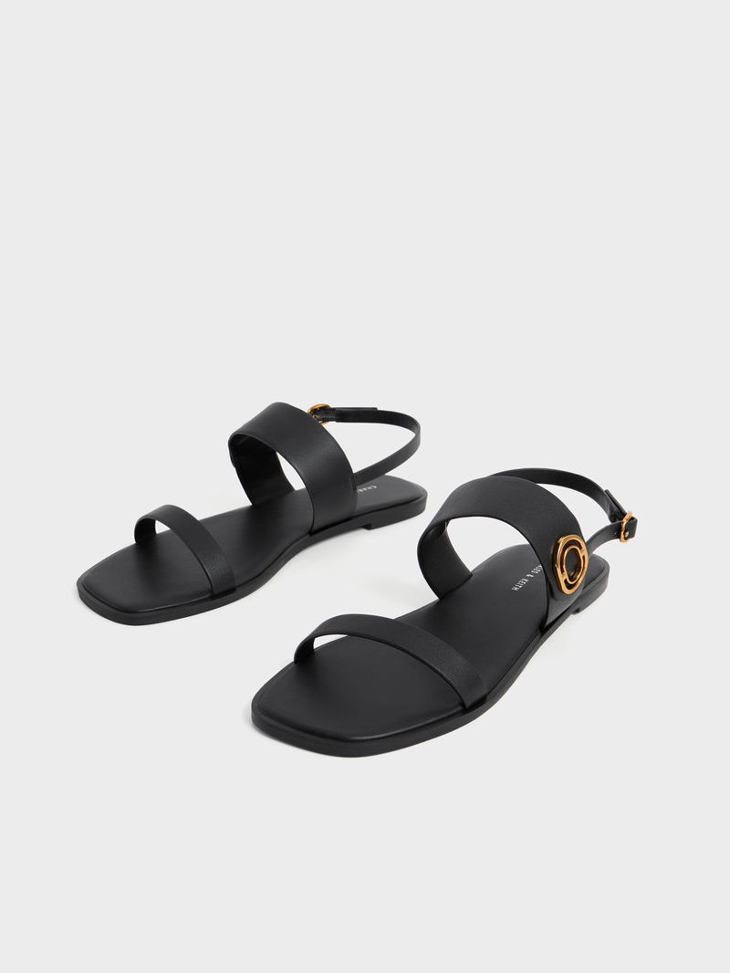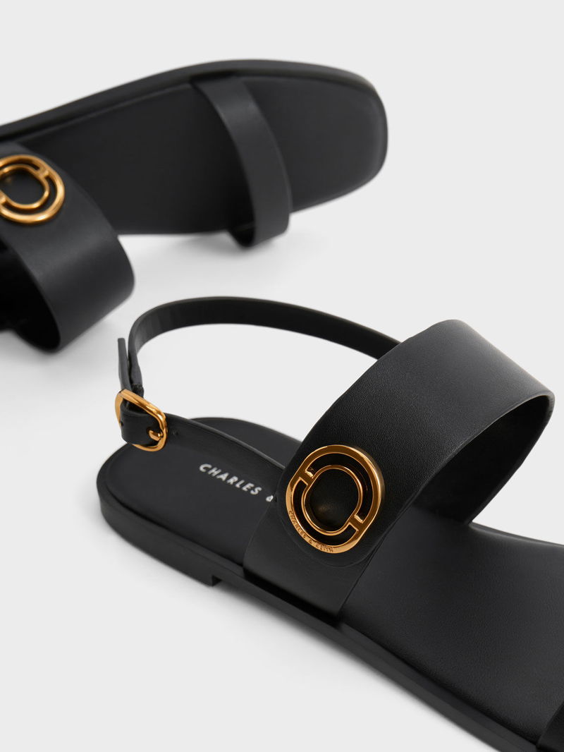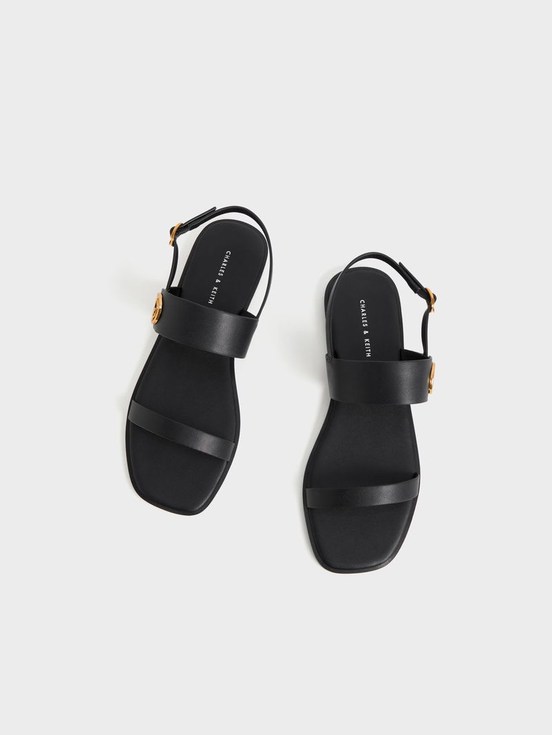 These back strap sandals in all black are an ode to effortless style. They are crowned with a gold-tone metallic accent by the side and also feature a back strap that you can adjust for a snug fit. Wear yours with a tank and tailored shorts.