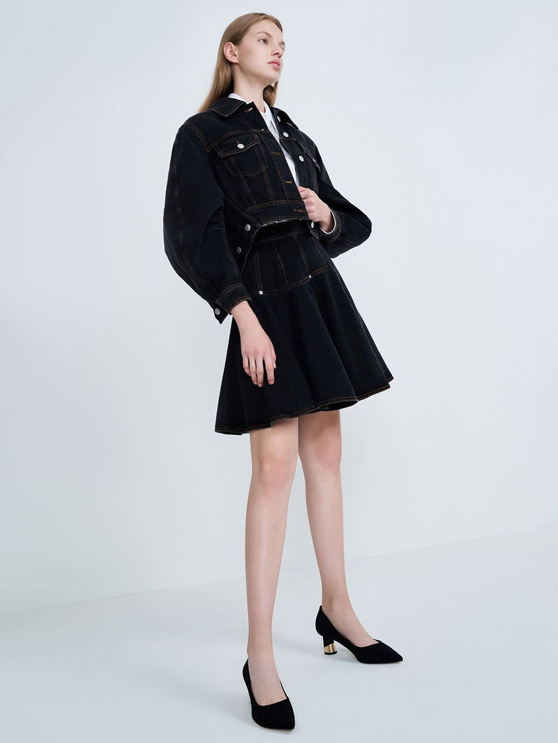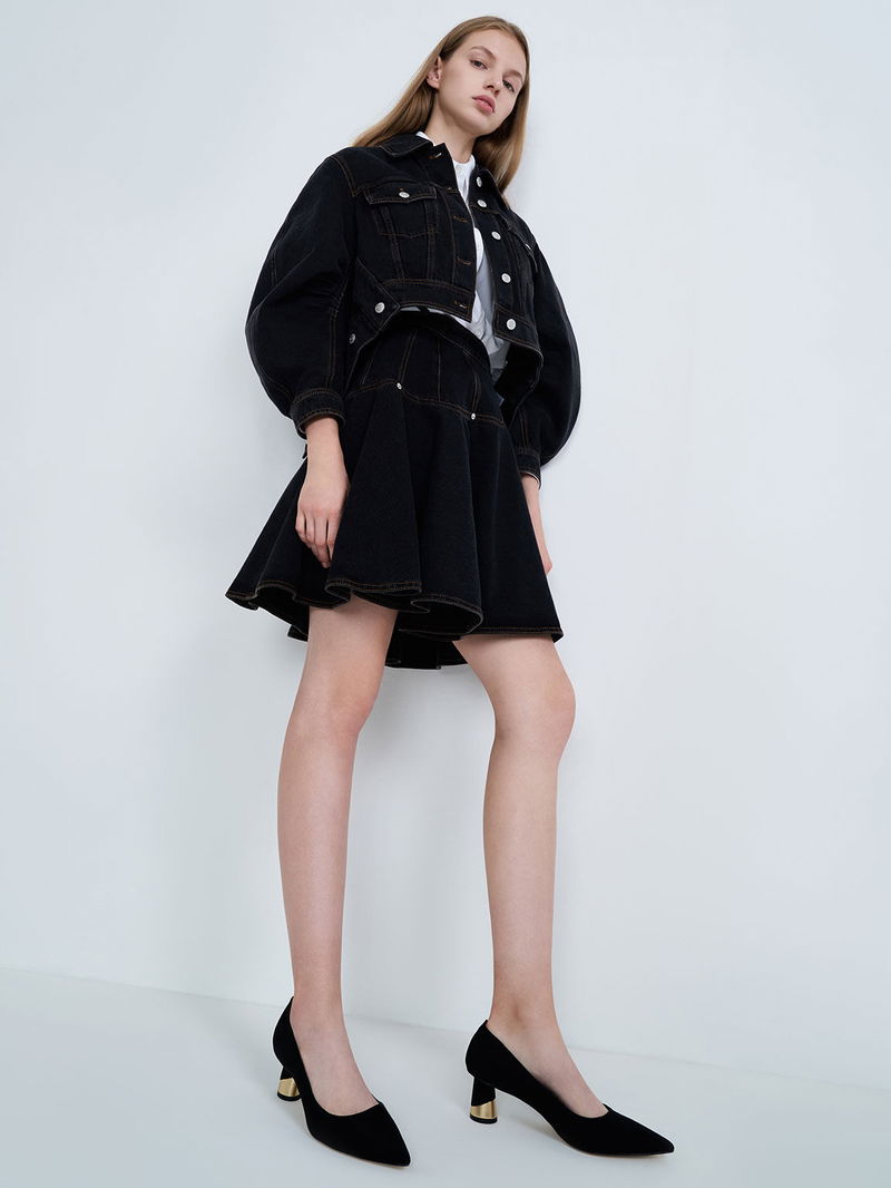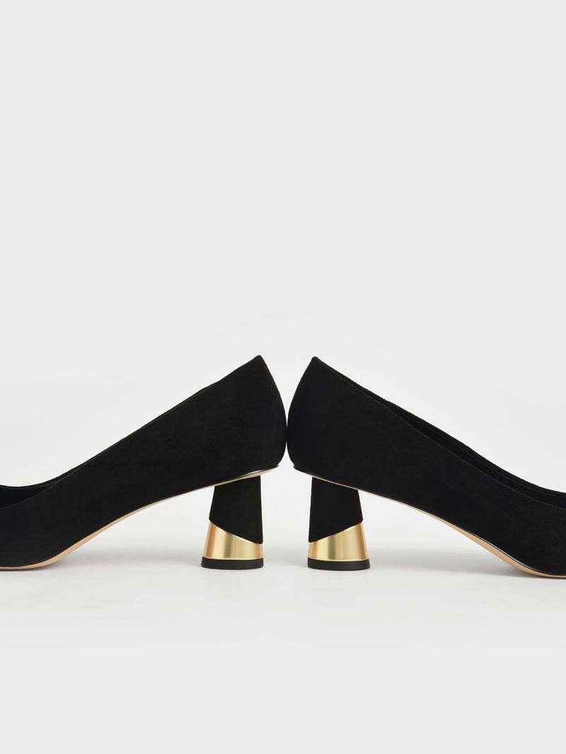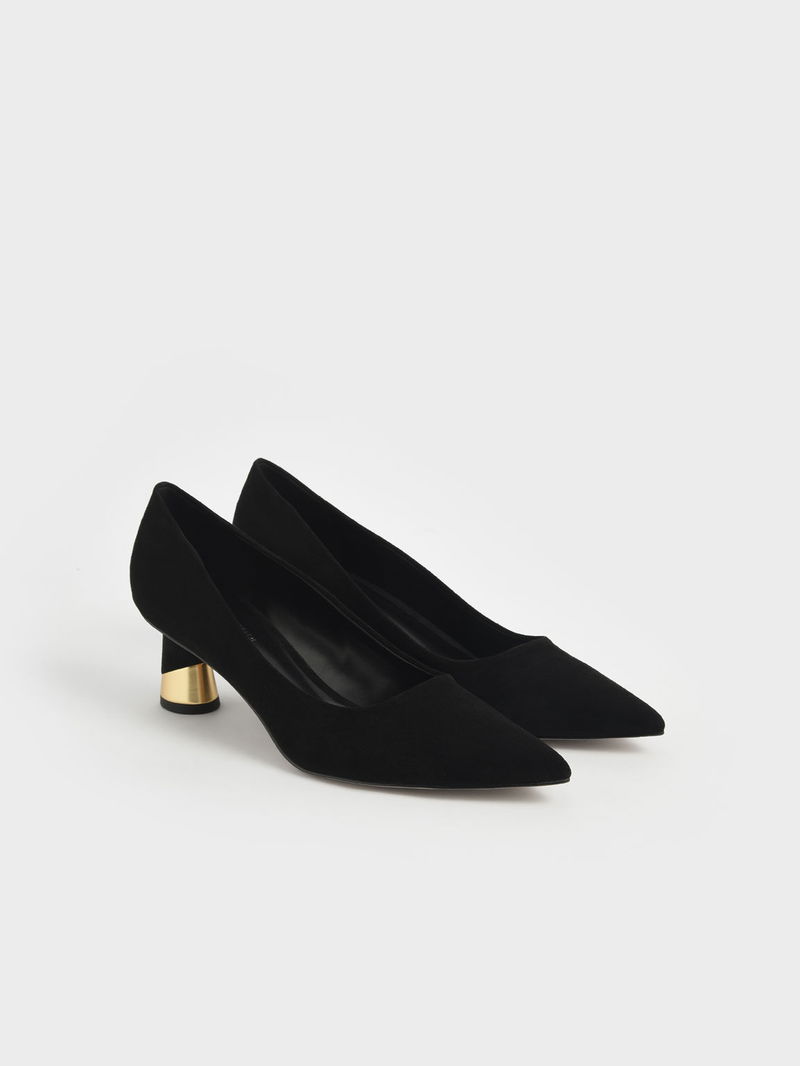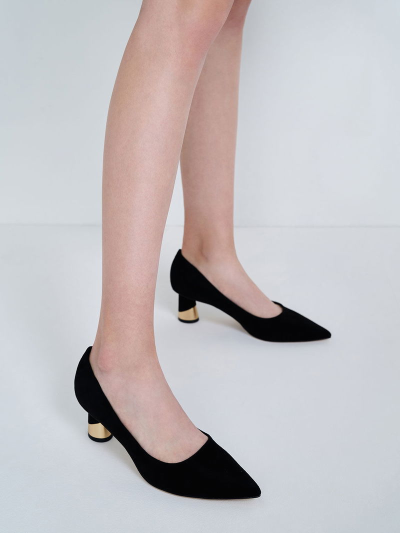 Looking classy throughout the week will be a cinch when you have these stunning pumps working for you. Fall in love with the impressive combination of the sculptural heels and textured black faux suede finish that will elevate your style with ease. Bonus points for the metallic accent at the heel that adds a whimsical touch to your looks. For an effortlessly chic ensemble, we recommend styling them with a smocked waist top, baggy jeans and a woven tote bag.