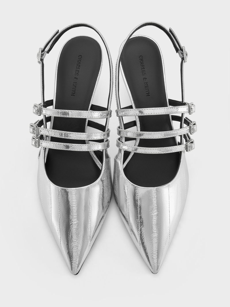Metallic Triple-Strap Pointed-Toe Kitten-Heel Slingback Pumps