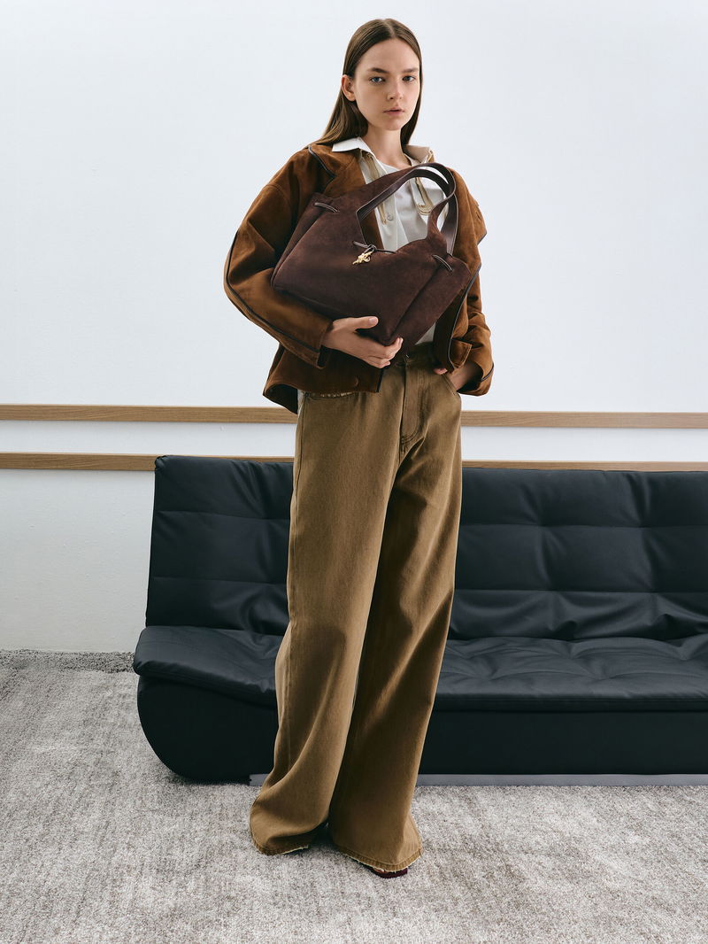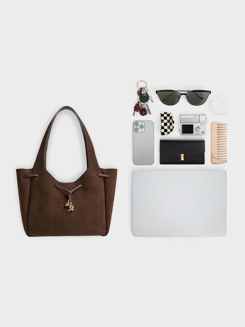 This Mila tote bag in espresso brown is made with recycled suede and features metallic-knot details, a magnetic closure and a soft, slouchy silhouette. It will complement tailored separates with its soft texture and relaxed shape.