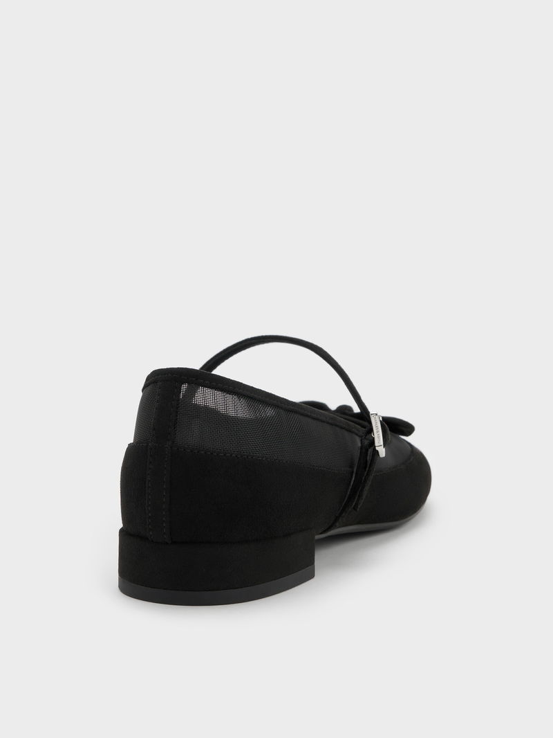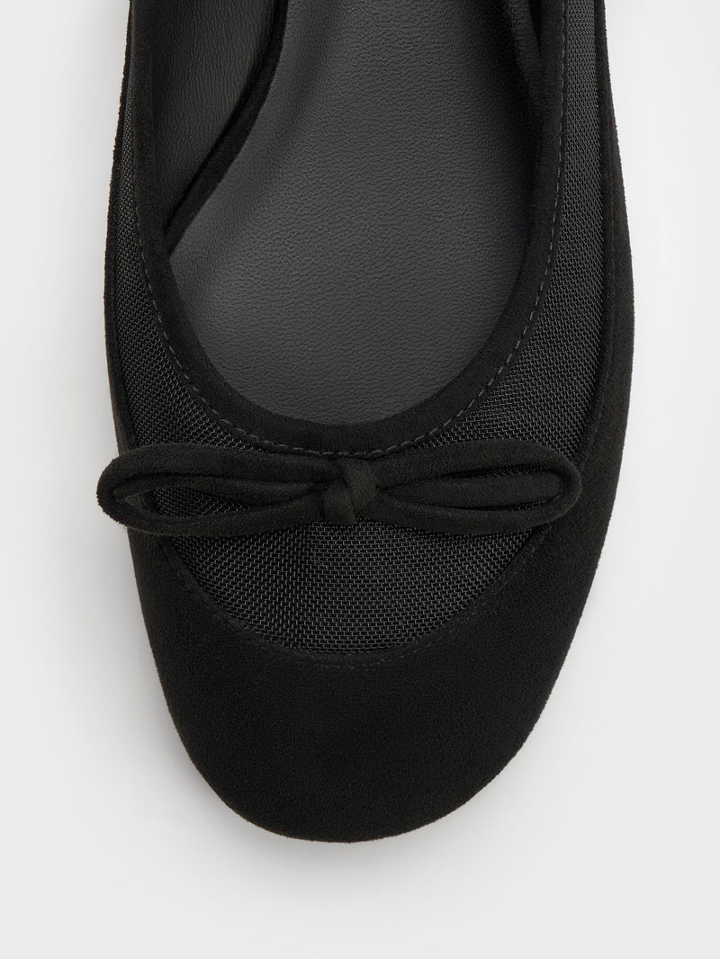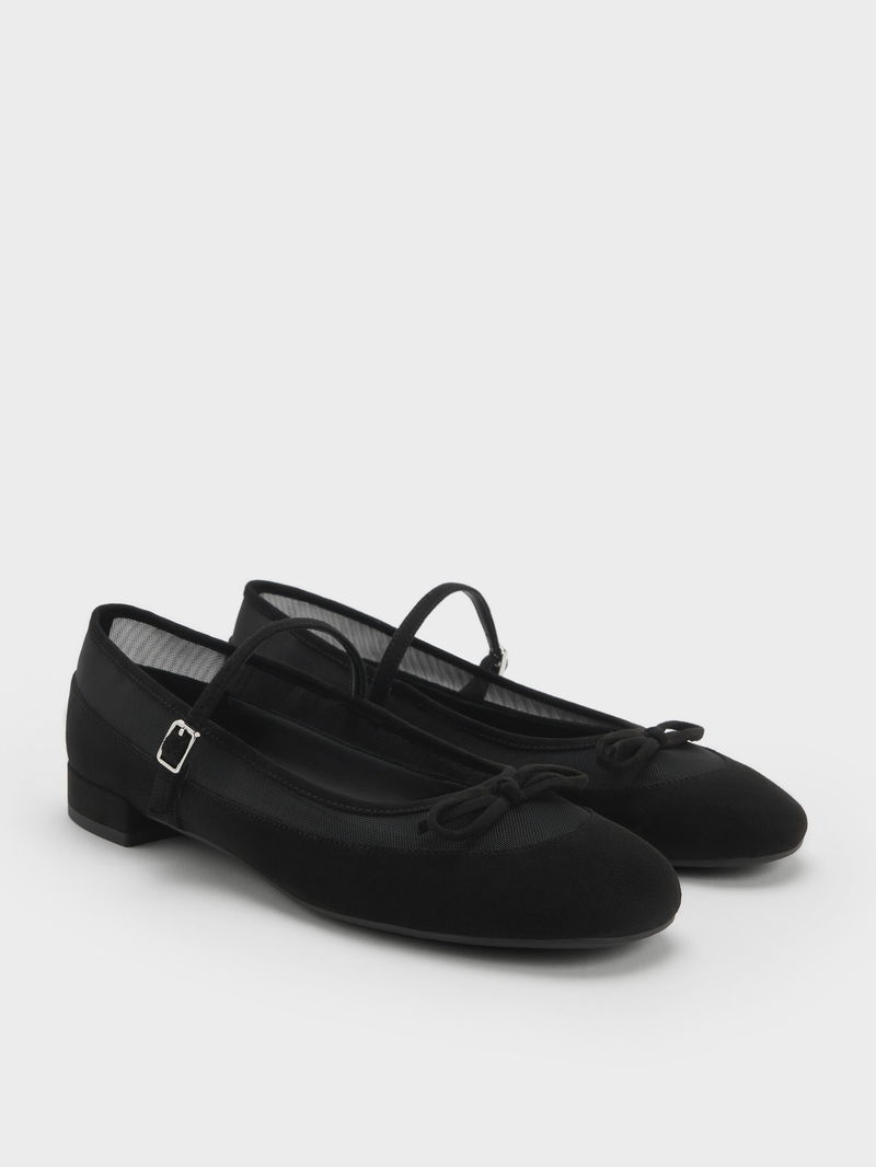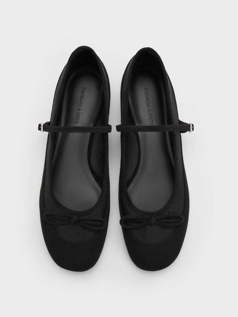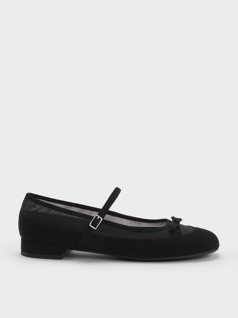 These Mulligan Mary Janes in black are made with faux suede and mesh. They feature dainty bows, covered round toes and slim adjustable straps for a comfortable fit.