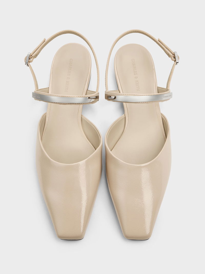 Patent Metallic-Accent Square-Toe Slingback Flats