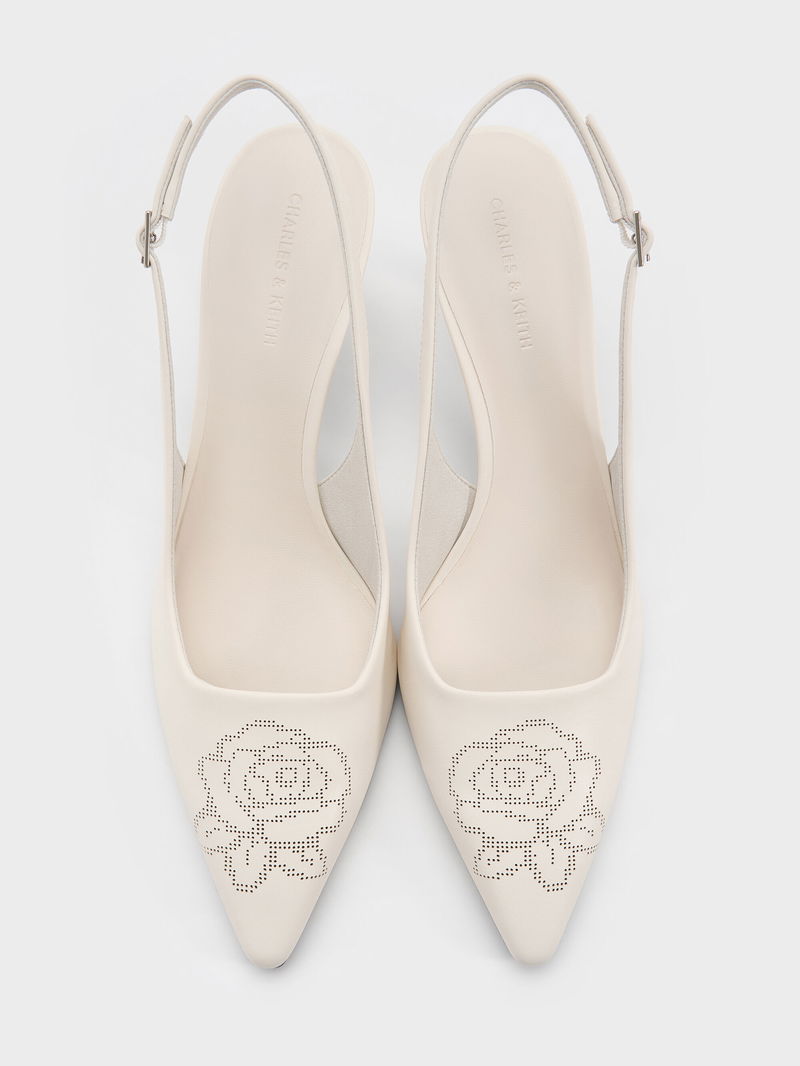 Perforated Rose Pointed-Toe Kitten-Heel Slingback Pumps