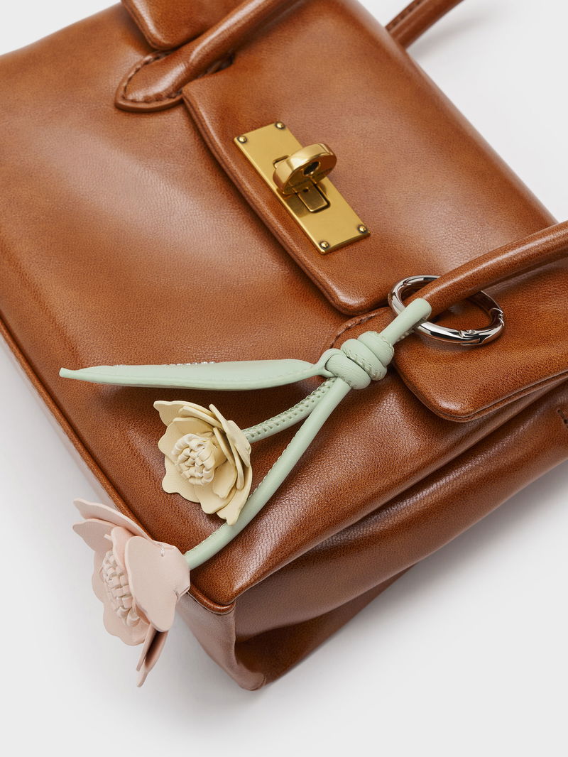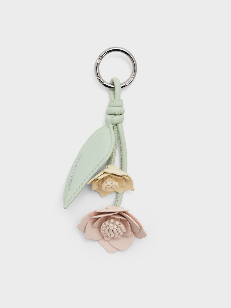 This whimsical and feminine charm and keychain features a cream rose, a pink rose and a mint-green leaf that are made with smooth faux leather.