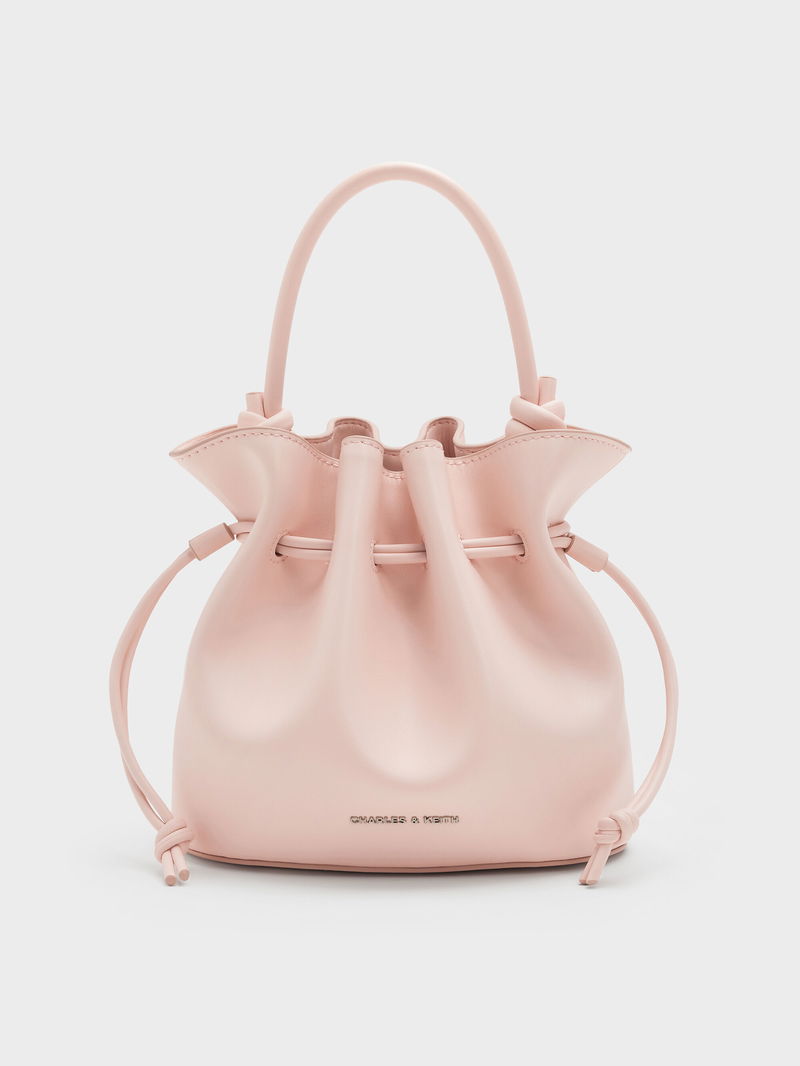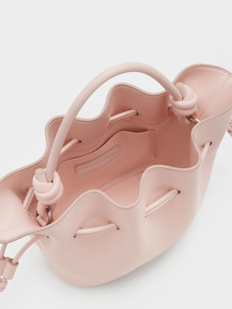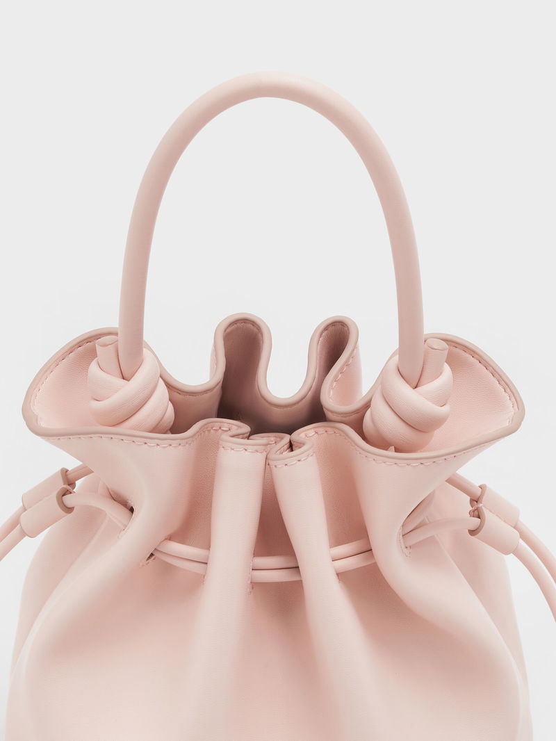 This Sammie bucket bag in soft pink features a knotted top handle, a drawstring closure, and sleek knotted dangling straps.