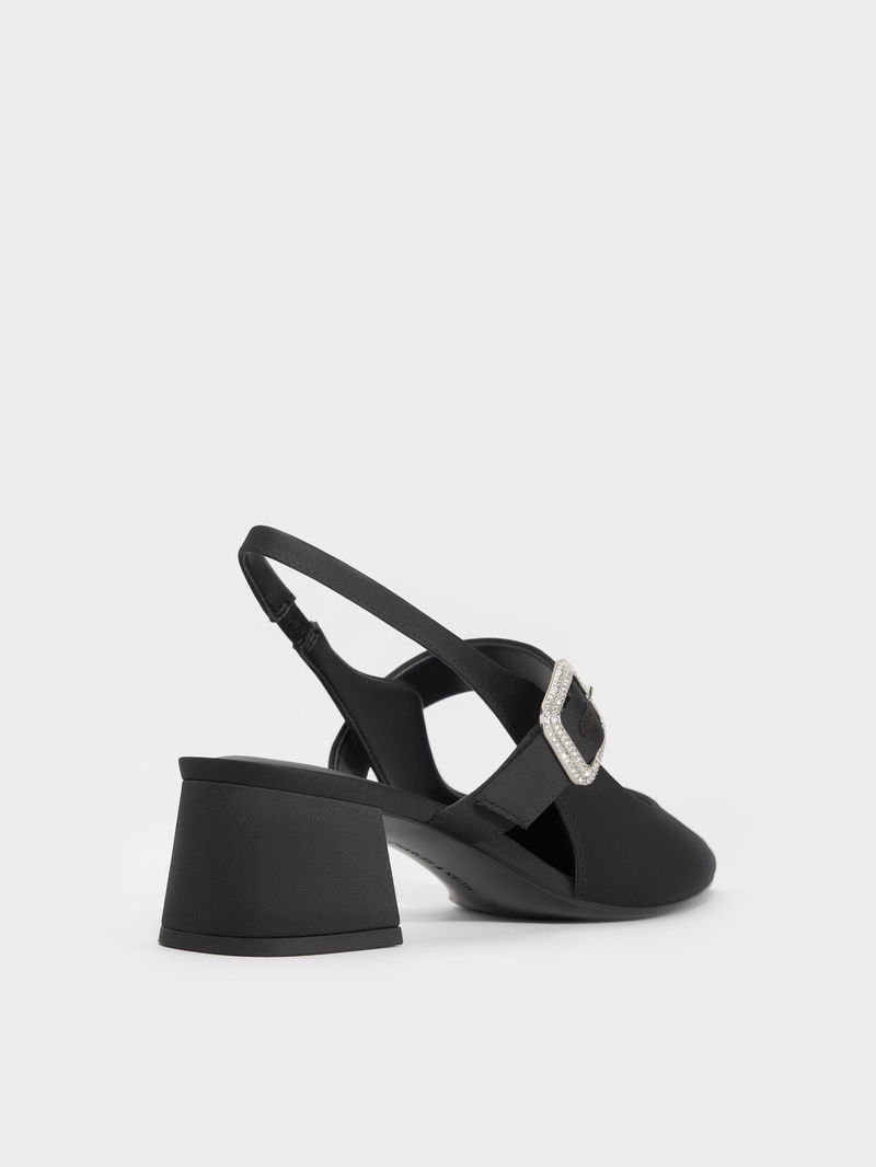 Satin Crystal-Buckle Block-Heel Slingback Pumps