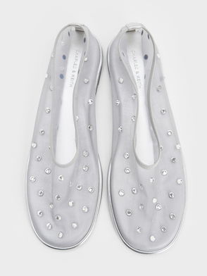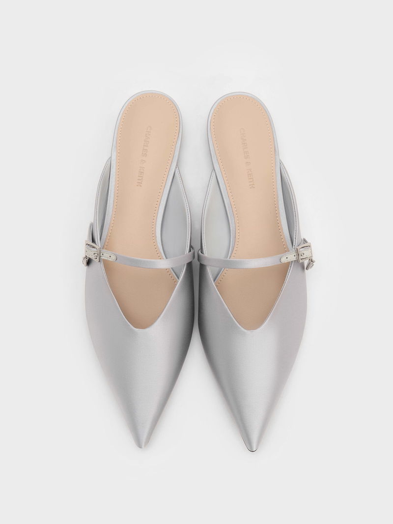 These flat mules in silver are made with satin and feature dangling teardrop crystals, slim buckled straps and pointed toes. Pair them with midi skirts for a casual ensemble that still feels considered and put-together.