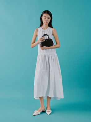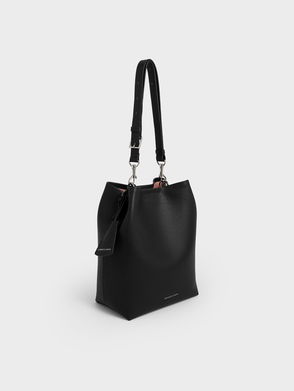 Add a delicious dose of lavishness to any outfit with this sleek black slanted bucket bag with metallic accents. Goes well with a ruched satin midi dress. Comes with detachable pouch.