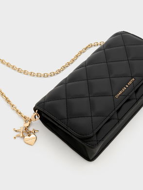 This season, keep all of your cards and cash neatly tucked away in this curved long wallet while staying stylish at the same time. With a front-flap design that comes with a stone-embellished turn-lock closure, practicality has never looked quite this pretty. Made in a versatile black, you can even go hands-free with the detachable chain strap if you wish. Show it off with a midi halter dress and pointed-toe mules.