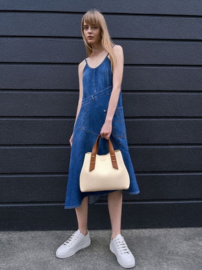 Play with size and keep things casual this weekend when you style this creamy caramel brown calf leather crossbody with a basic t-shirt and ripped jeans. Bonus points for the blue stripes and turn-lock in a gold finish.