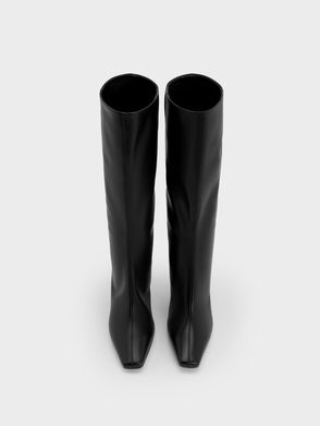 The thighs the limit when it comes to styling these sleek black patent boots. Create maximum wow factor when you pair them with an oversized sweater dress and a chain link crossbody bag.
