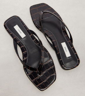 Prep for the perfect poolside look when you slip into these chocolate brown thong sandals. The perfect off-duty finish to a cropped top and denim shorts combo.