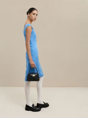 Vintage elegance with a modern twist. The classic tweed material is making a contemporary comeback, this time in an enchanting dark blue and white combination. Bonus points for the nifty braided chain strap. Bound to inspire you to bring some old-school glamour into your everyday wardrobe, simply style this gem with a smock dress and pumps for a feminine look.