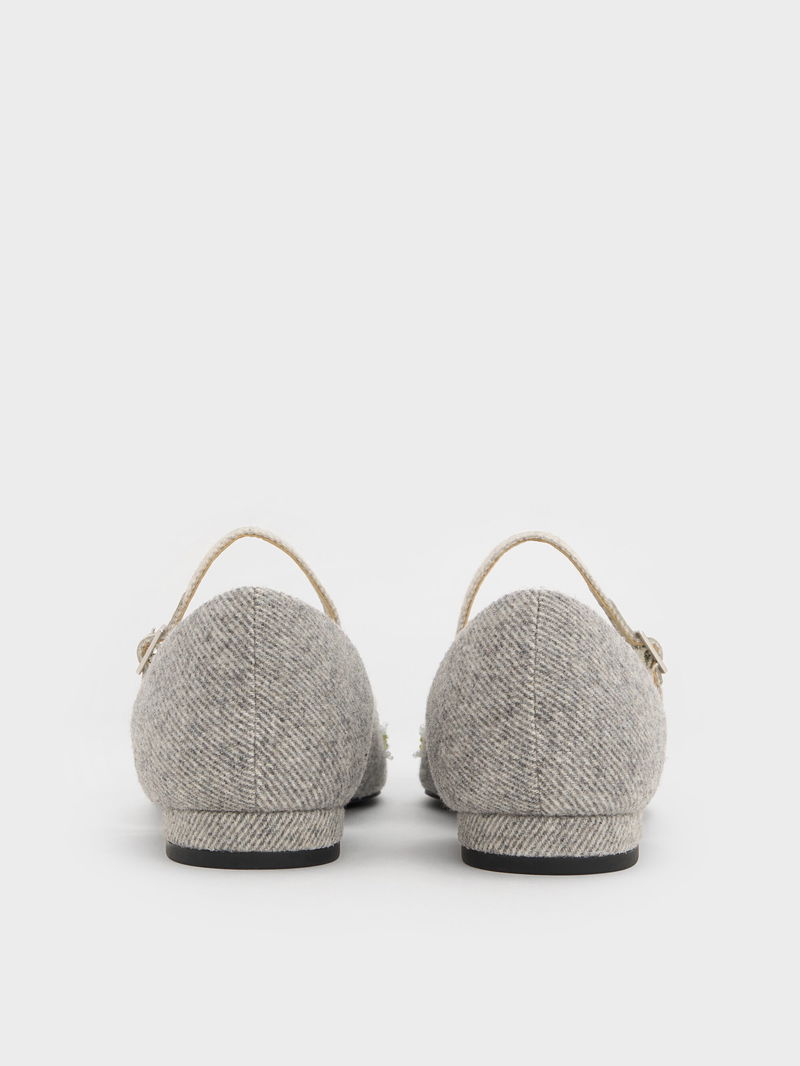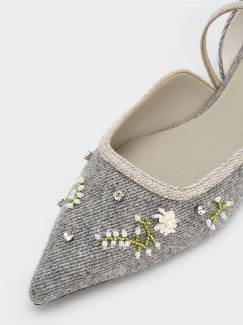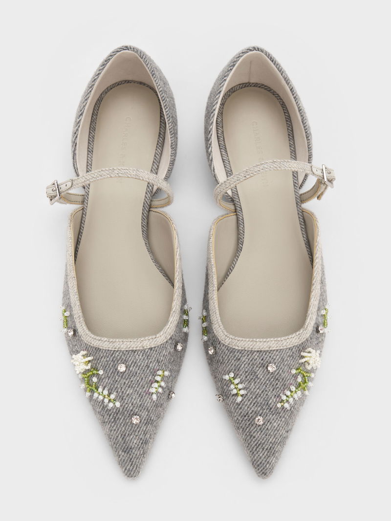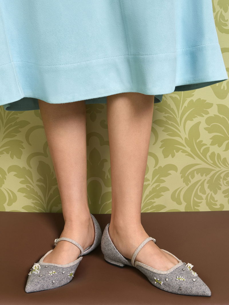Twill Bead-Flower Pointed-Toe D'Orsay Mary Jane Flats