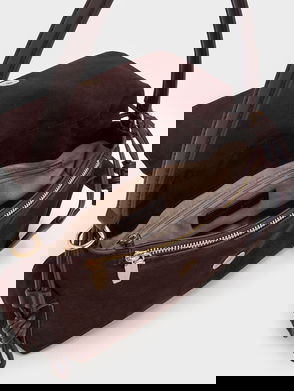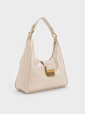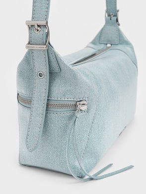 Add style points to your next lunch date ensemble with this blue wrinkled patent semi-circle bag. Sling it as a crossbody over a square neck top and a ruffle midi skirt for a head-turning look.