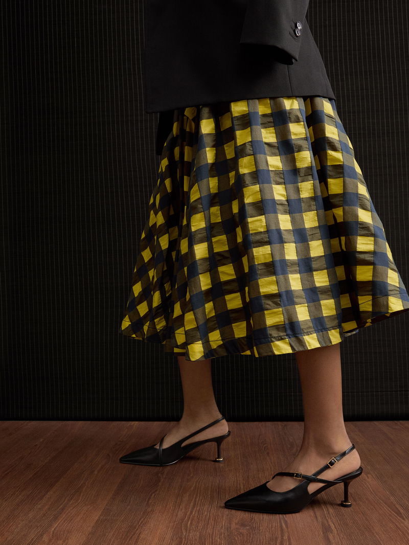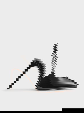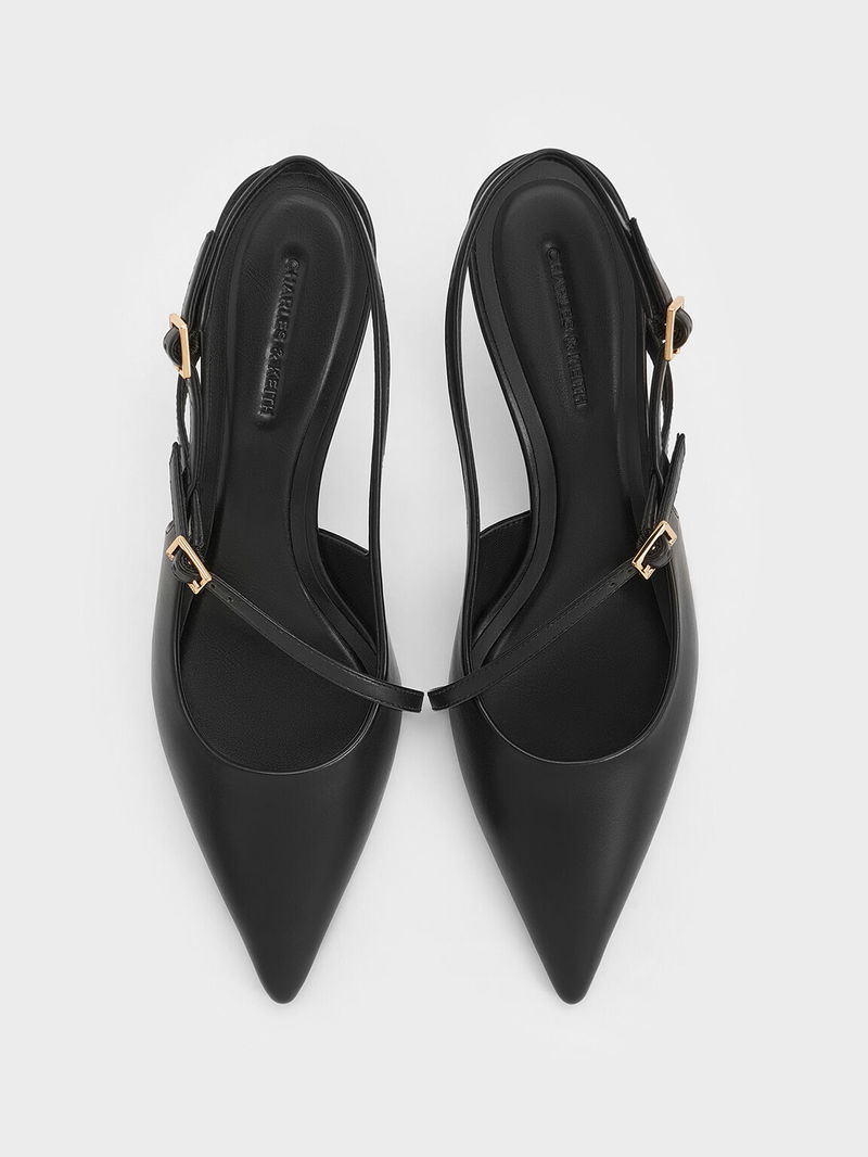 Sharp and polished, these black slingback pumps blend the classic with the edgy. Featuring thin buckled straps that cut across the vamps, their striking heels will give both your stature and confidence a boost.