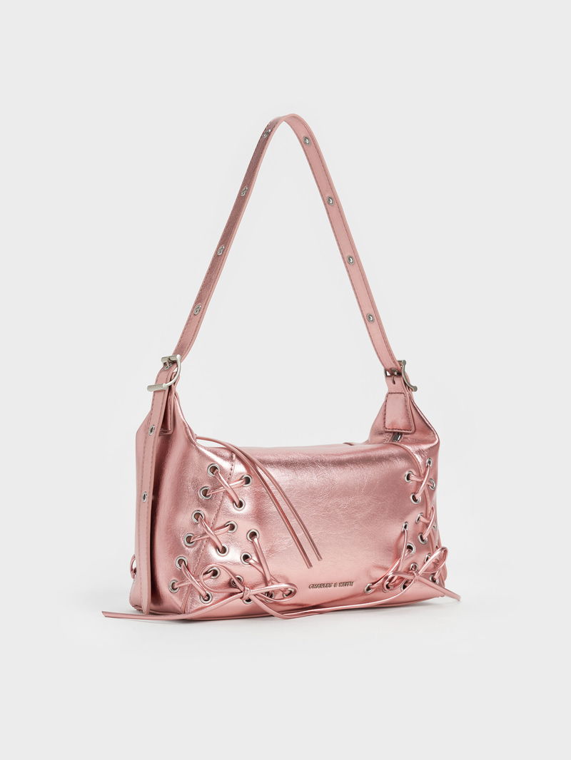 Detailed with grommet lace-up accents, our Xylia shoulder bag will add a cool, edgy touch to any outfit. Its metallic pink finish is especially striking -- perfect for taking you from day to night in impeccable style.