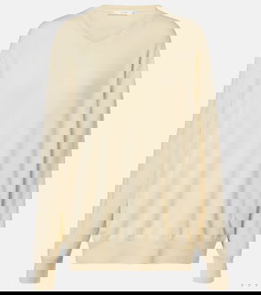 This mid-weight cream 100% cashmere sweater was created in collaboration with artist Caroline Popham. It's shaped for a classic fit and features true-intarsia shapes in cream, dust-blue and flame-red.