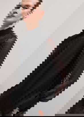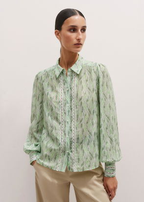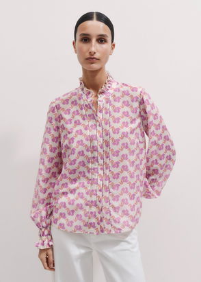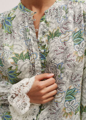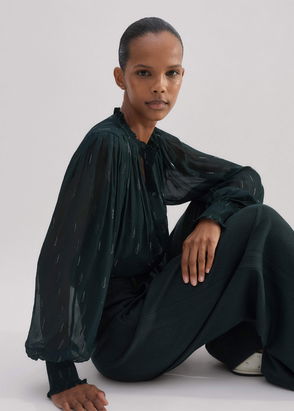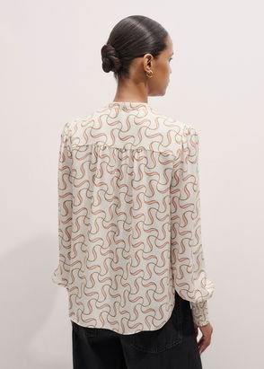 Cut for a romantic silhouette, this silk twill blouse features blouson sleeves and a button-fastening keyhole back detail. The hand-painted spot print, in cream, black and orange, pops against a rich green background. Tuck yours into slim-fitting trousers to balance the voluminous silhouette.