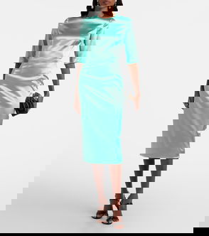 Part of a collection inspired by the Bloomsbury Group, this elegant dress features a hand-painted spot print in cream, black and orange on a green background. Cut from silk twill, a subtly textured fabric, it features contrast trims, a keyhole back and front slit at the midi skirt. The tie waist creates a flattering silhouette. Wear yours with knee-high boots for a sophisticated day-to-evening aesthetic.