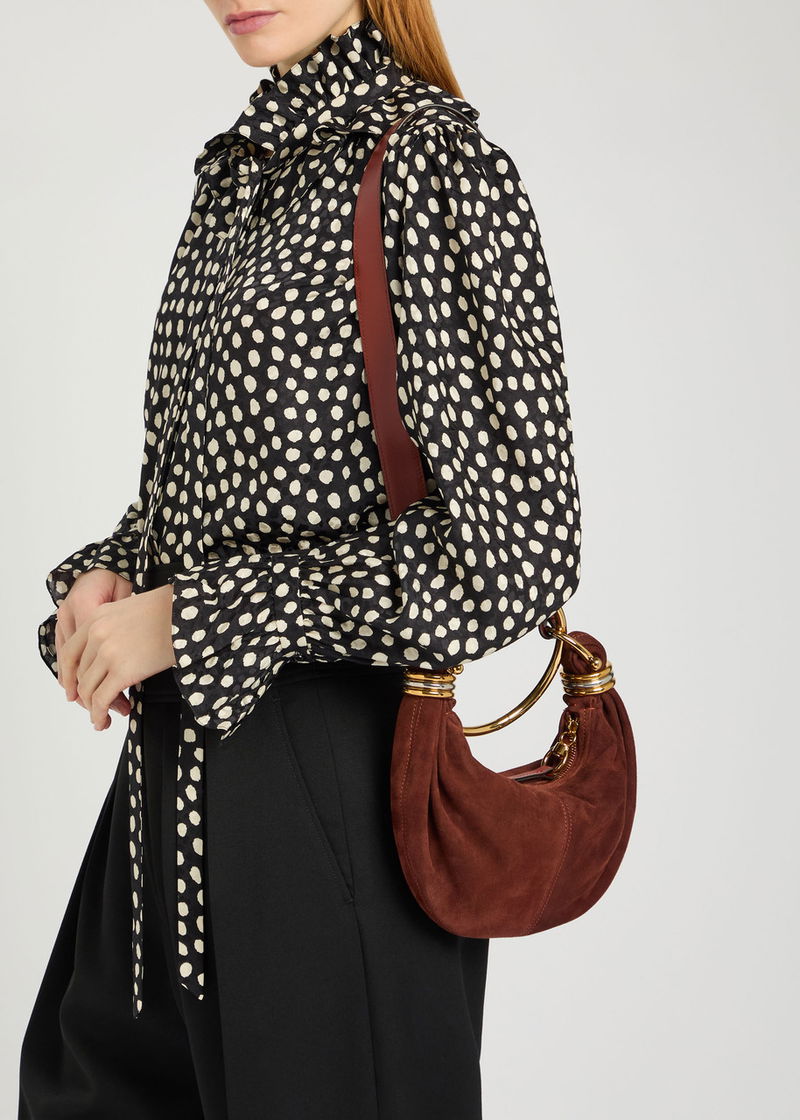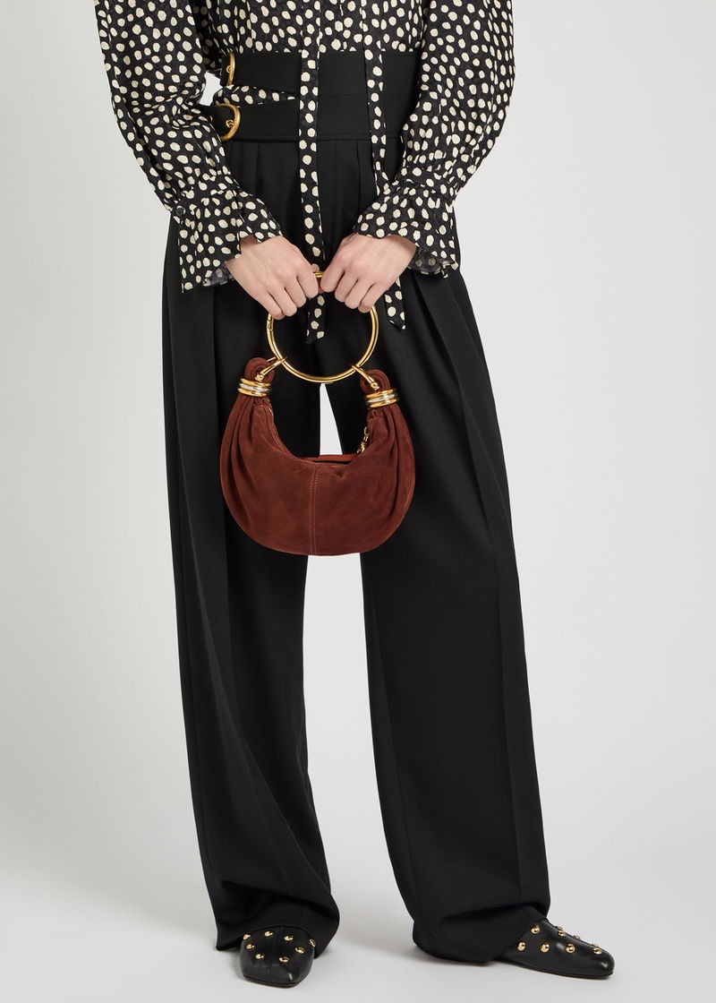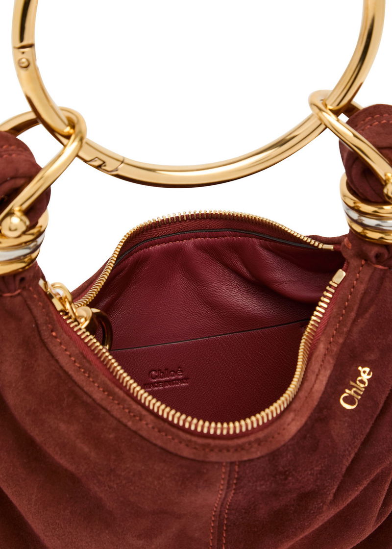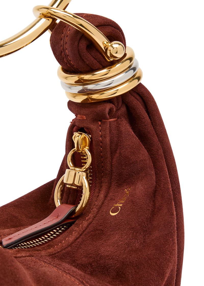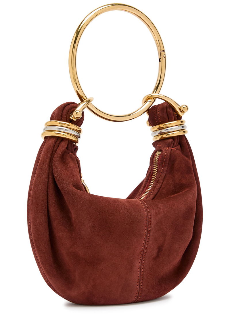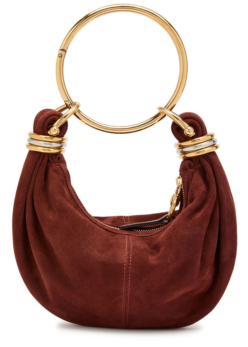 Chloé suede top handle bag. Detachable metal hoop top handle, detachable adjustable leather shoulder strap, metallic designer stamp, two-tone metal hardware, internal slip pocket, leather lining. Zip fastening at top.