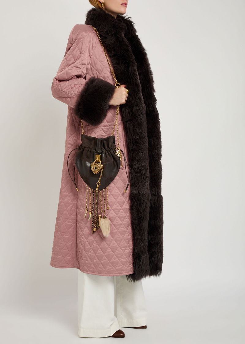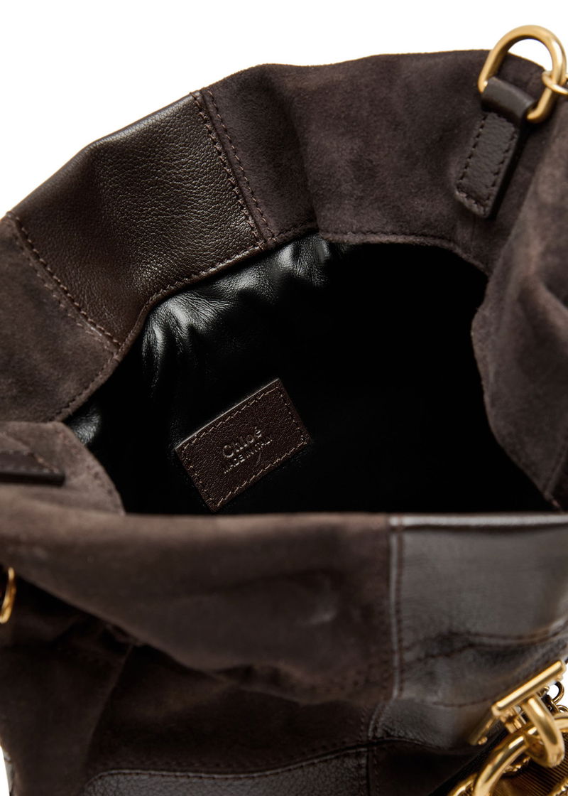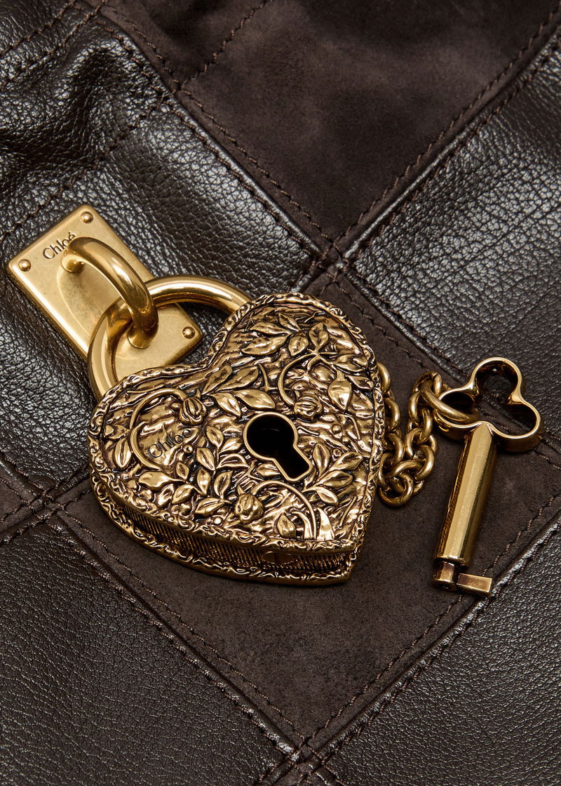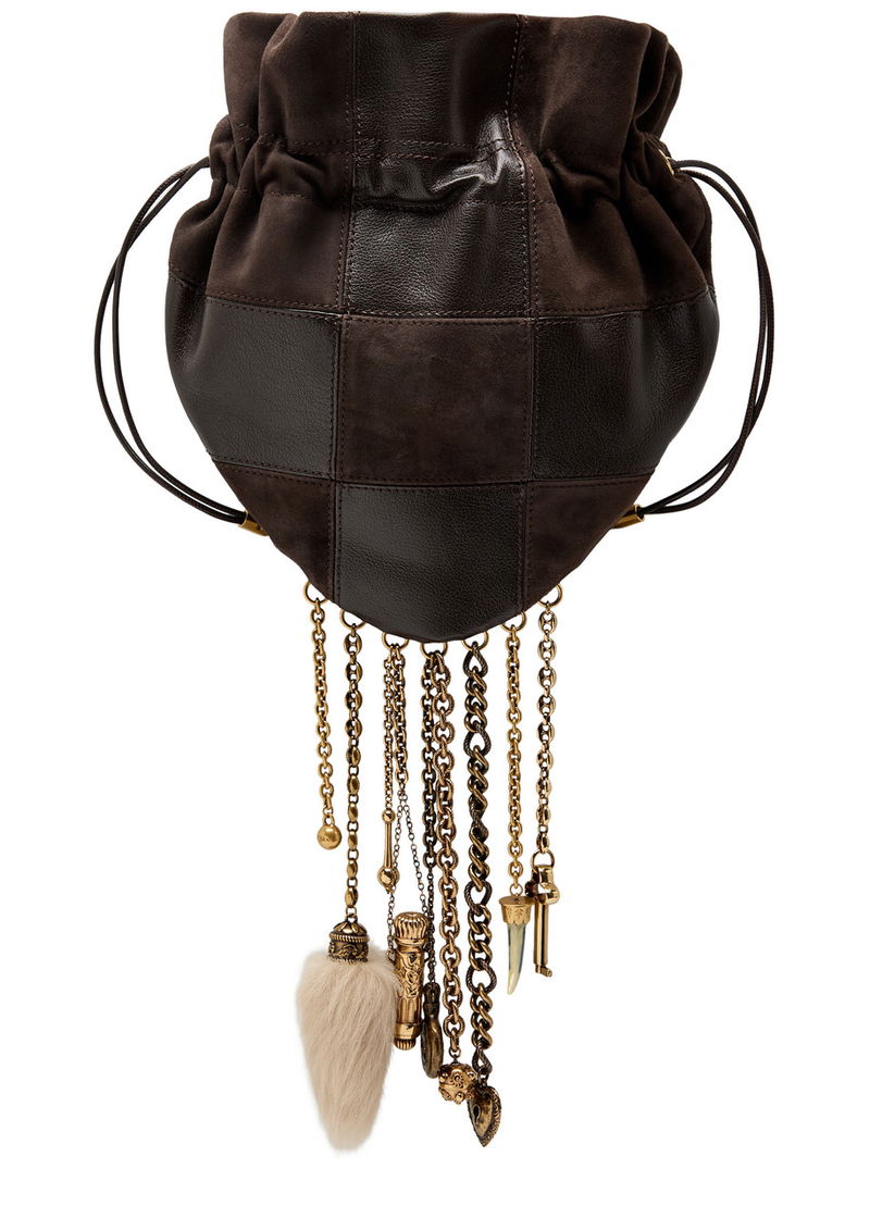 Chloé suede shoulder bag. Charm-embellished chain shoulder strap, leather panels, detachable padlock and key embellishment, charm embellishments at base, leather lining. Drawstring at open top.