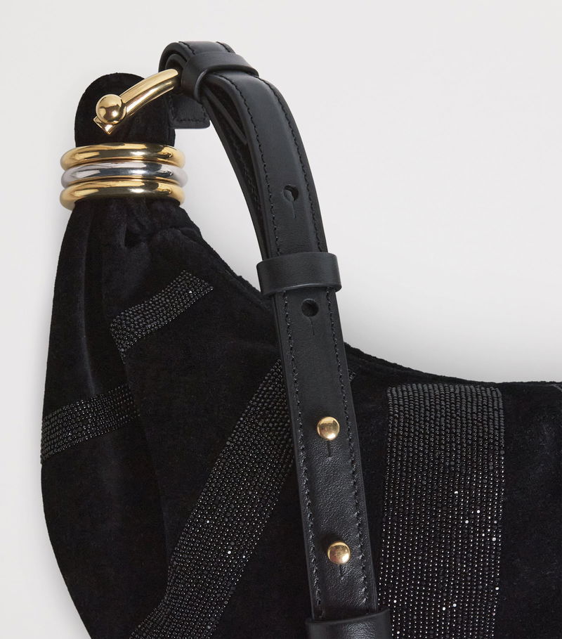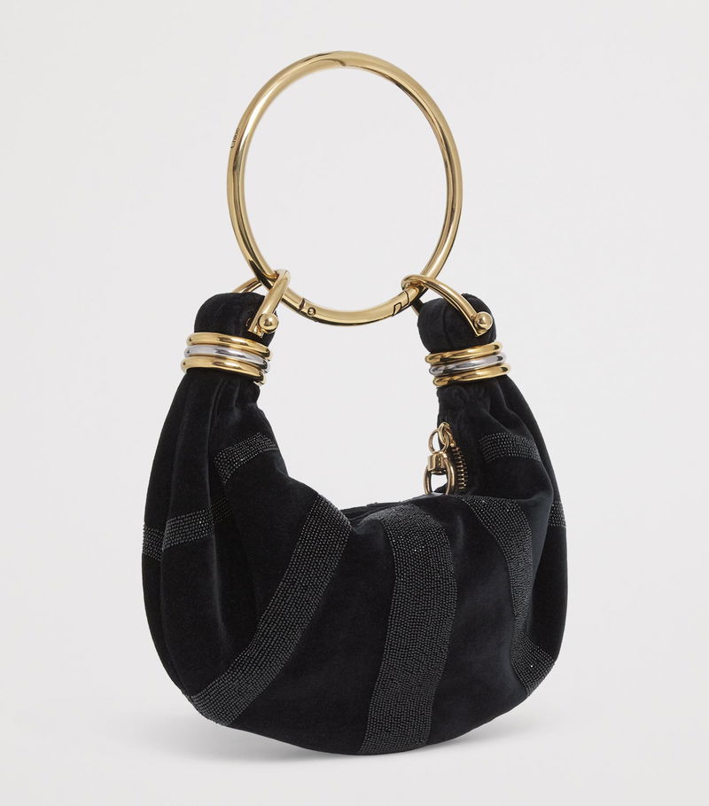 Chloé is renowned for its carefree, bohemian-influenced approach to fashion design, but the Maison is equally enamoured with architectural hardware. The Bracelet top-handle bag rests comfortably in this intersection, boasting a slouchy cotton velvet profile, adorned with striped crystal glass embellishment, that's suspended from a gold-tone ring - the detail from which the accessory gets its name.