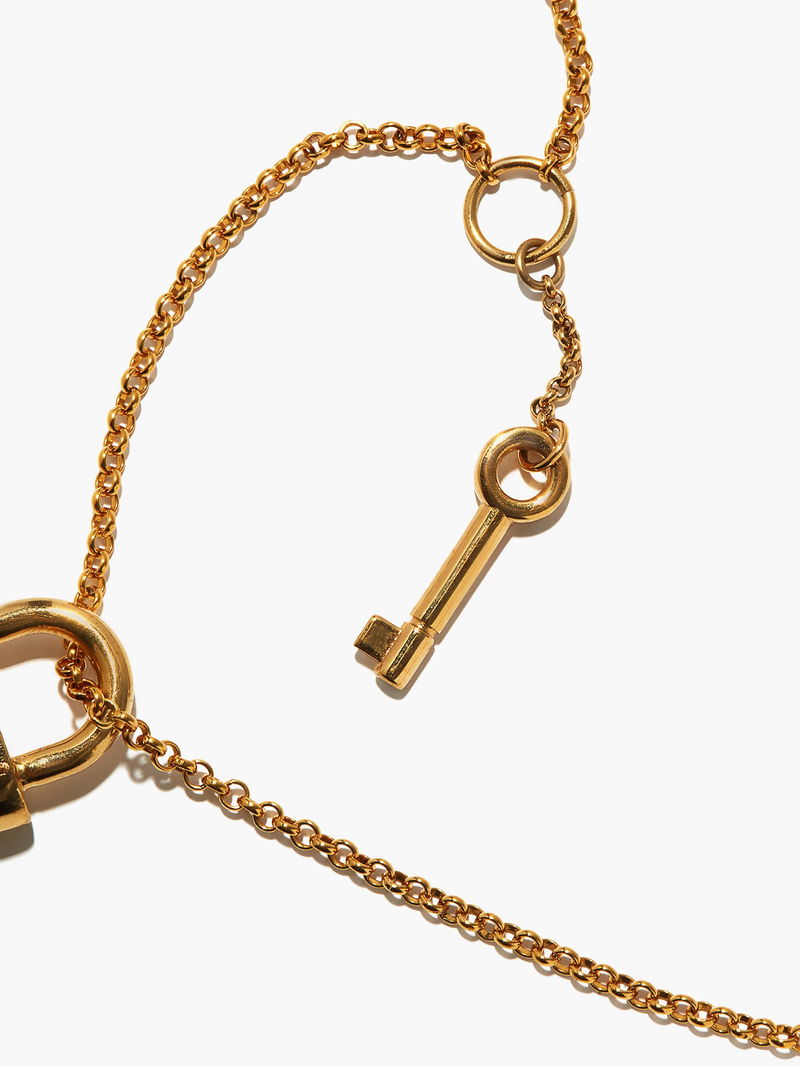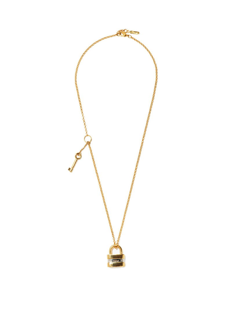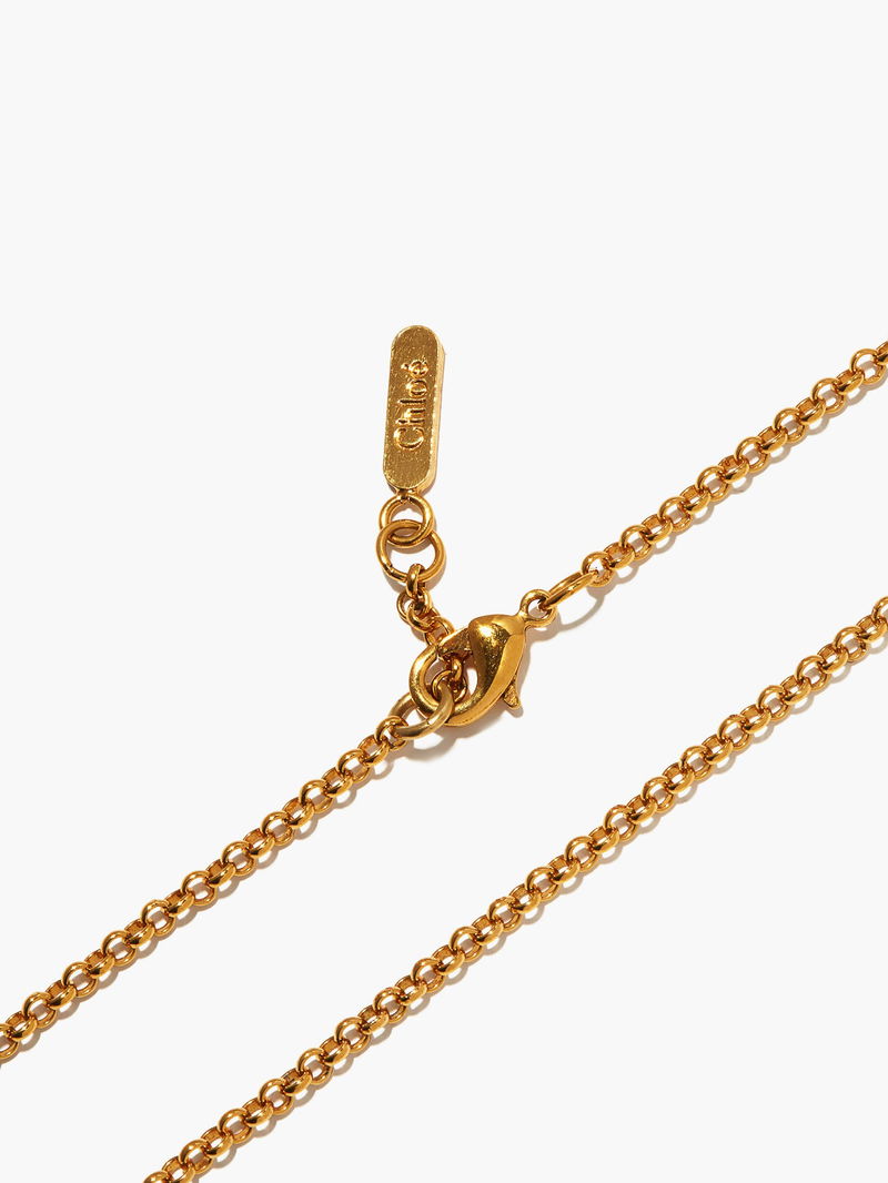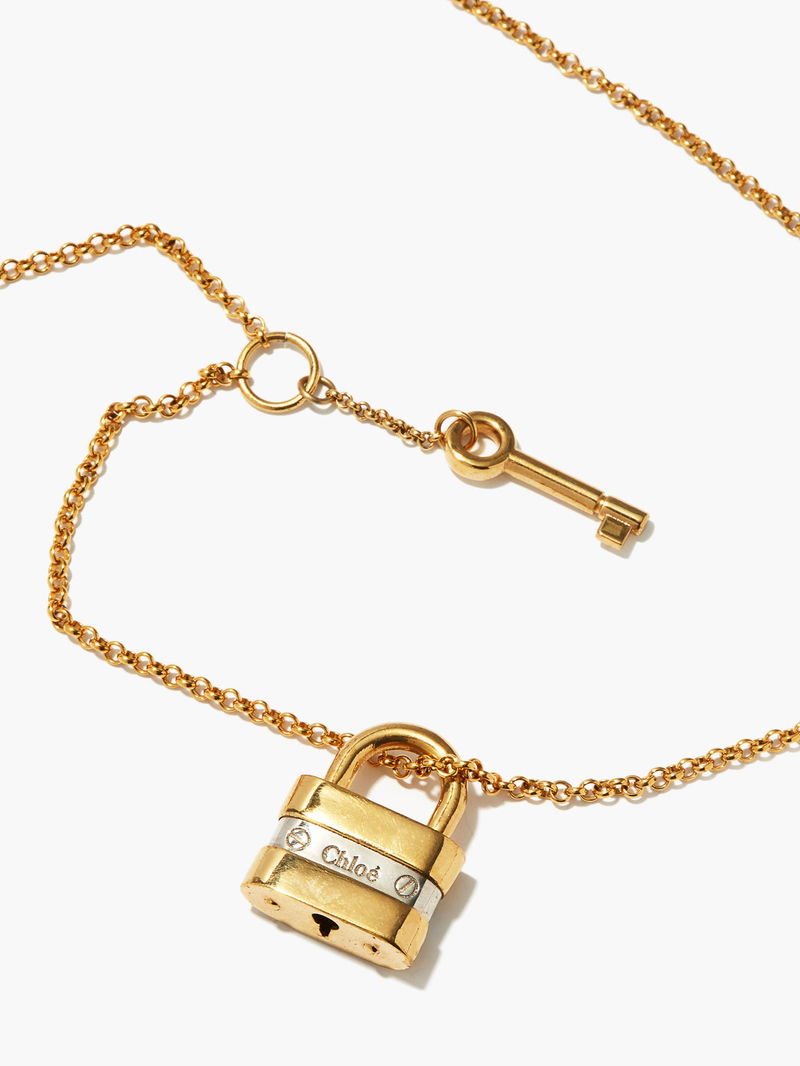 This gold-tone metal Colleen necklace is partnered with a long-standing Chloé icon, the logo-engraved padlock and accompanying key – first seen on the label's coveted Paddington bag in 2006. Crafted in Italy, the long rolo chain fastens with a lobster clasp then set with a shiny, hammered plaque. Note how the contrasting silver-tone metal central band makes this piece especially versatile.
