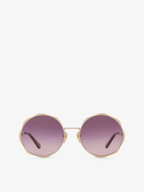 Chloé's oversized pink Elaia sunglasses are outlined with contoured, waved lilac rims to highlight the round silhouette. They’re handmade in Italy from gold-tone metal with gradient lenses and engraved with subtle logos across the temples. Note the cutouts at the tips to attach a chain.