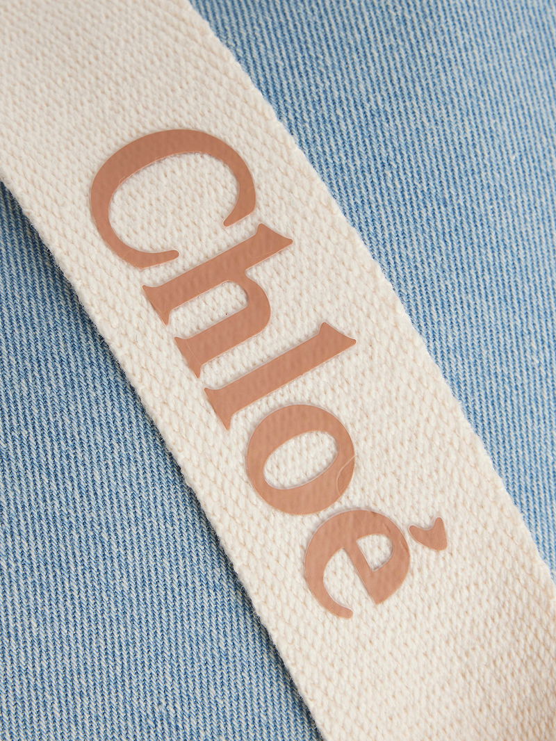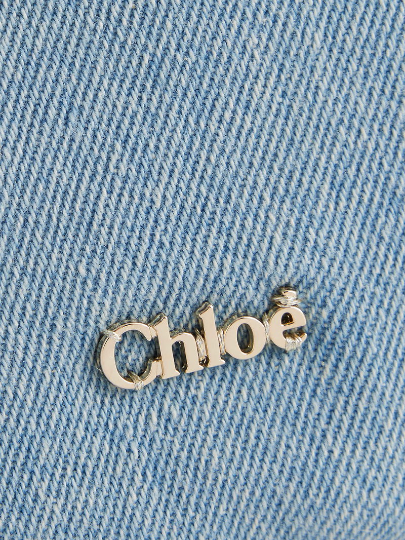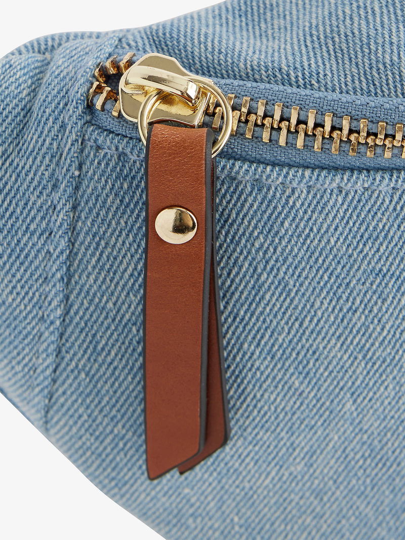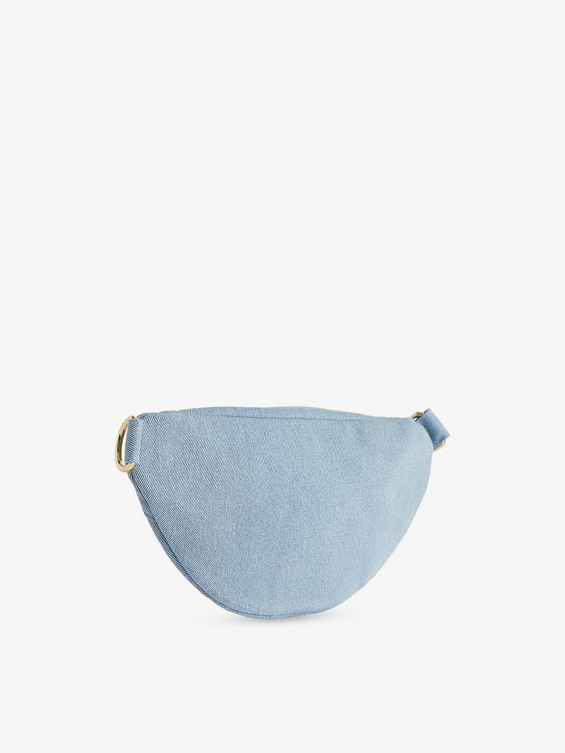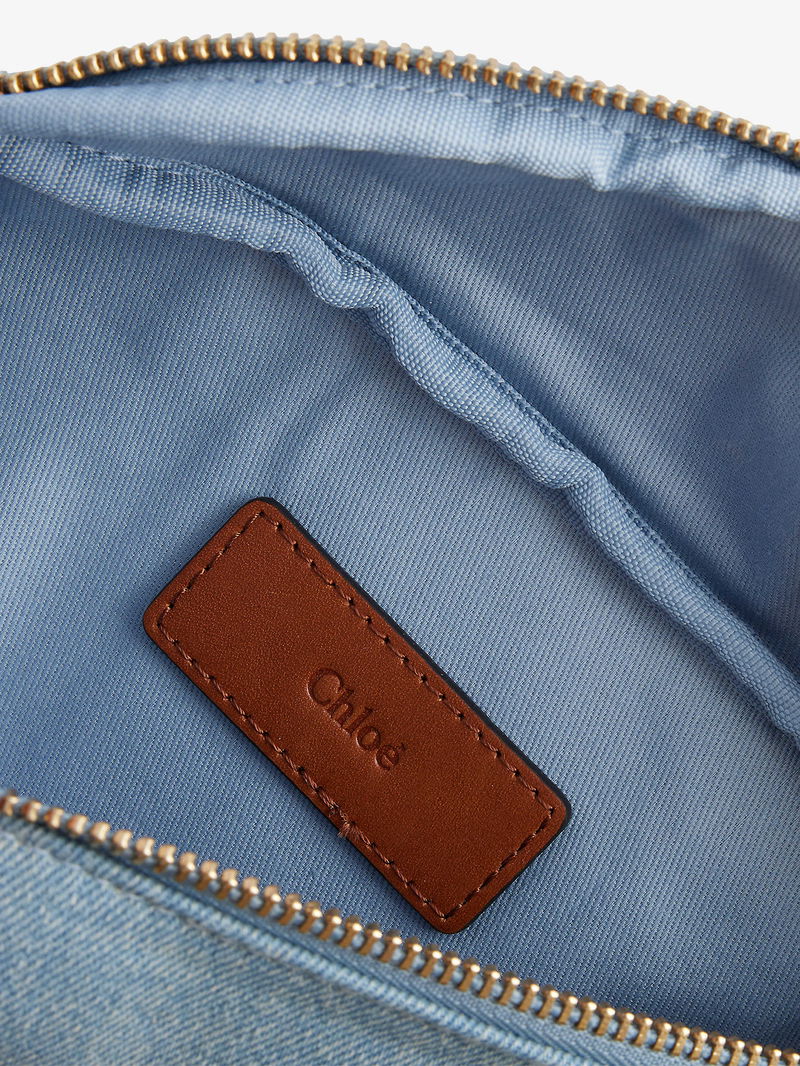 Chloé denim bum bag. Zip fastening. Curved shape, two detachable branded canvas straps, brand design plaque at front, leather trims, gold-toned hardware, one main compartment, internal brand patch, fully lined.