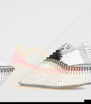 Chloé leather sneakers. Designer plaque at tongue, perforated logo at side, perforated details, logo-debossed suede heel panel, scalloped trim at rubber midsole, rubber sole, round toe. Lace-up front.