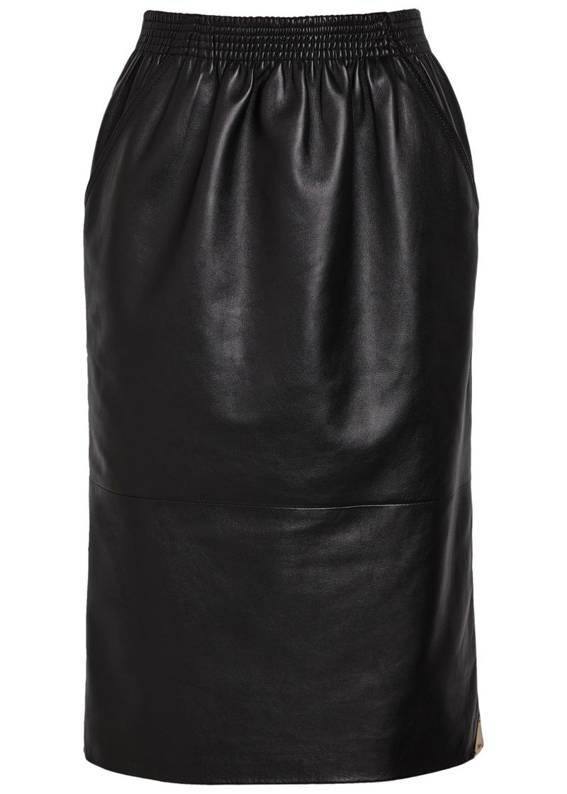 Chloé leather pencil skirt. Shirred waistband, side slip pockets, designer plaque at hem, back vent, fully lined.